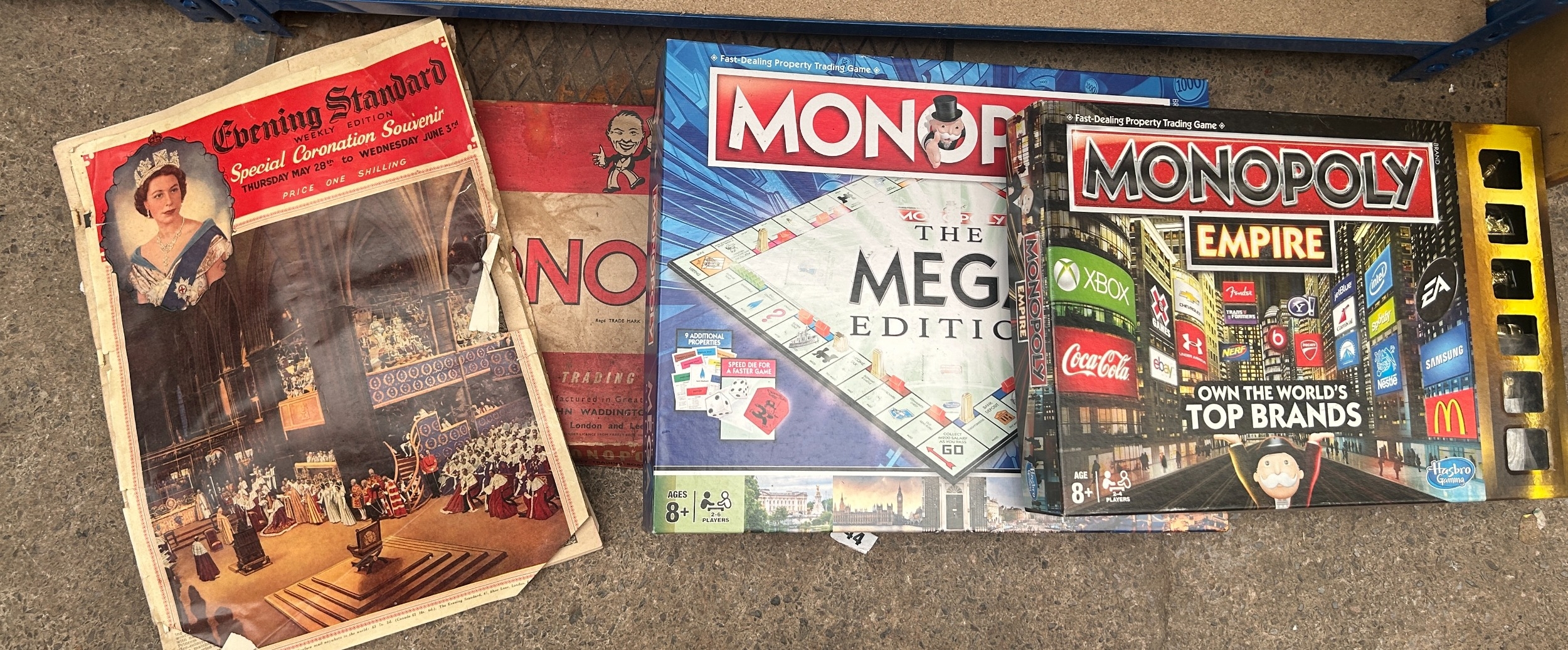 Vintage boxed Monopoly game set together with Monopoly Mega edition and Empire edition etc and Elizabeth II Coronation Souvenir edition of Evening Standard