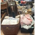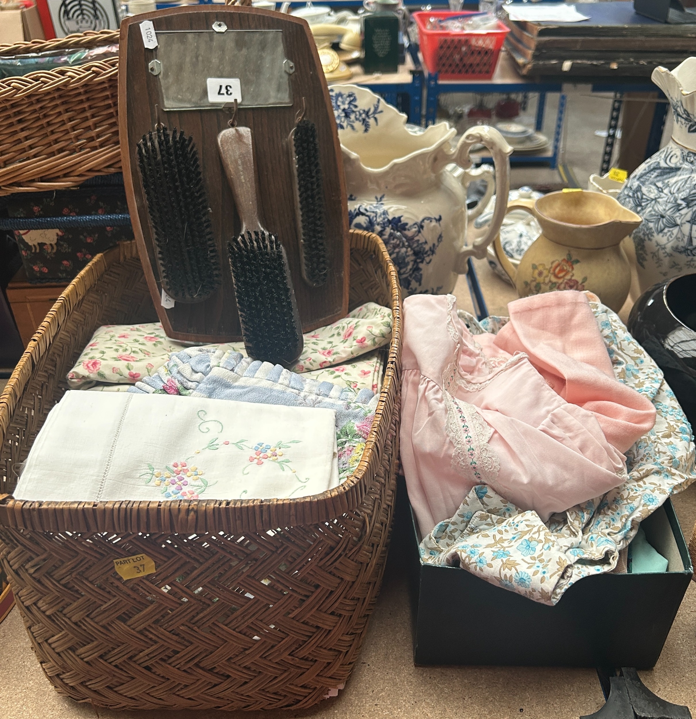 Collection of good quality vintage textiles to include embroidered table linens, bed sheets, vintage children’s / doll’s gowns etc and an oak wall-hanging clothes brush set