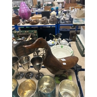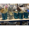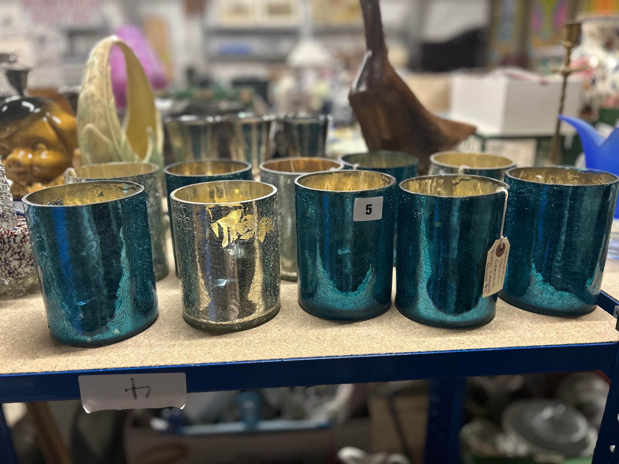 Group of 10 crackle glass candle holders in blue and silvered glass, each 13cm high.