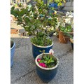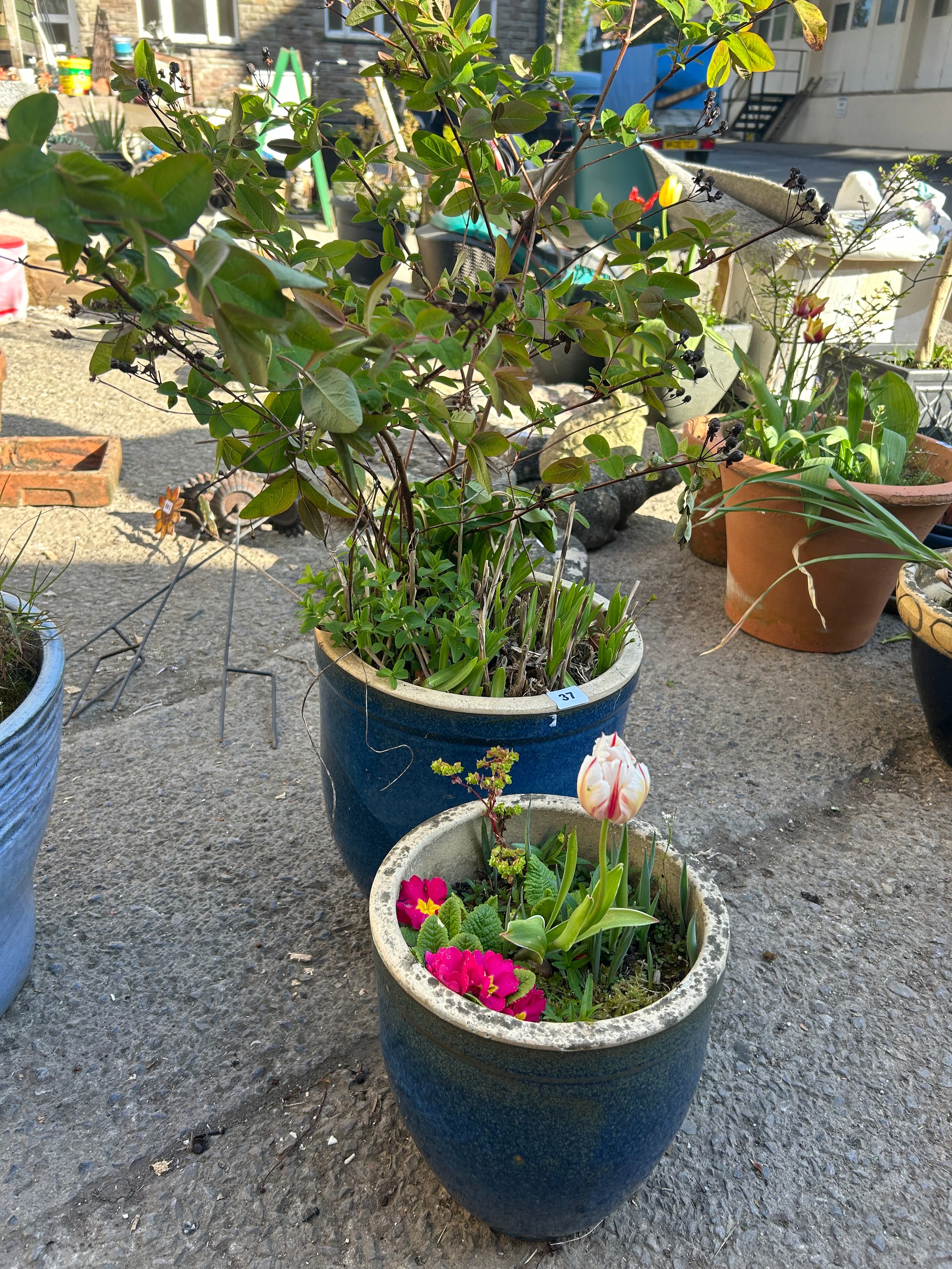 Two planted blue glazed garden plant pots, the largest 35cm high, 32cm diameter, the small example planted with tulip, primroses and other bulbs (2)