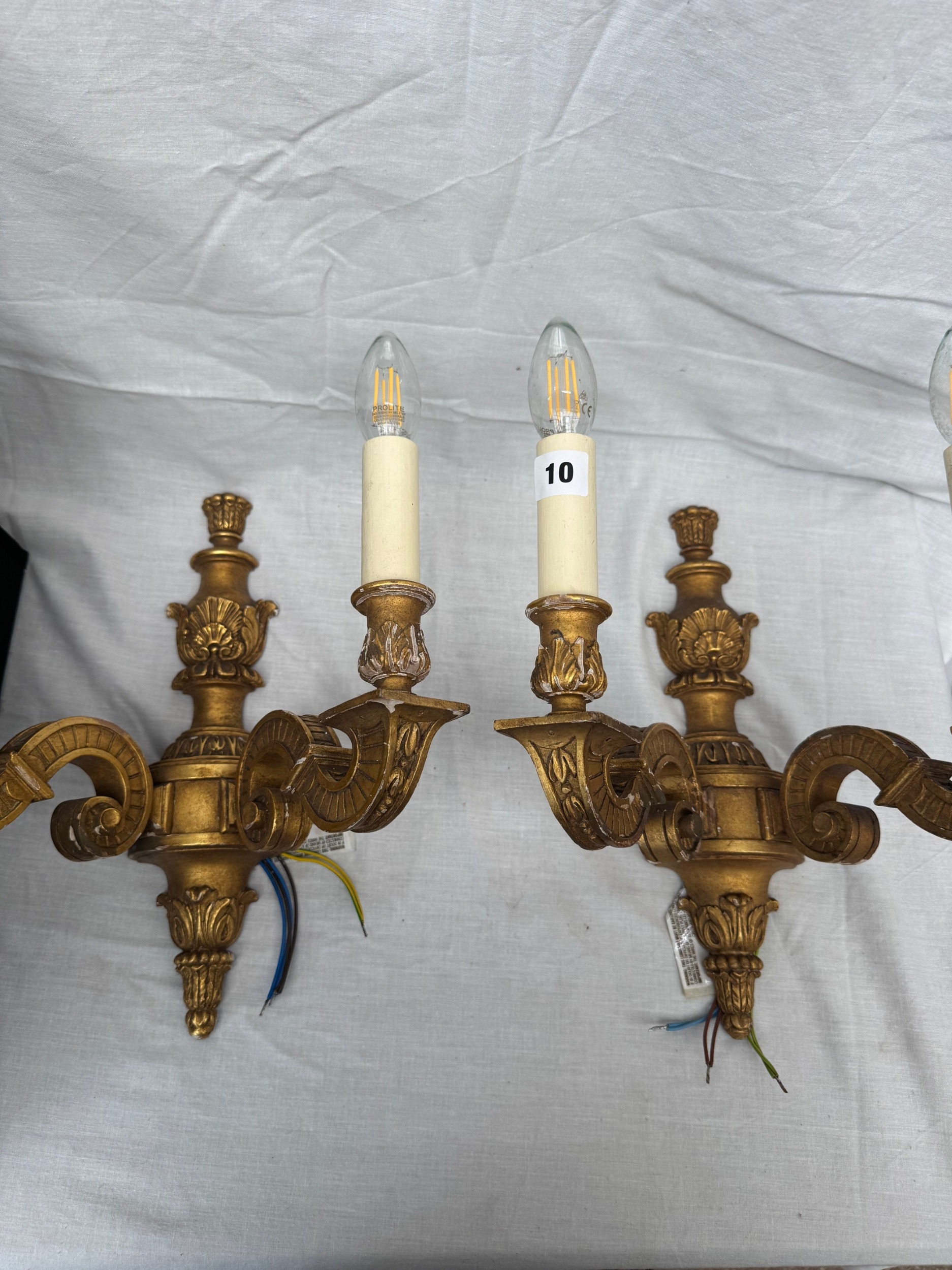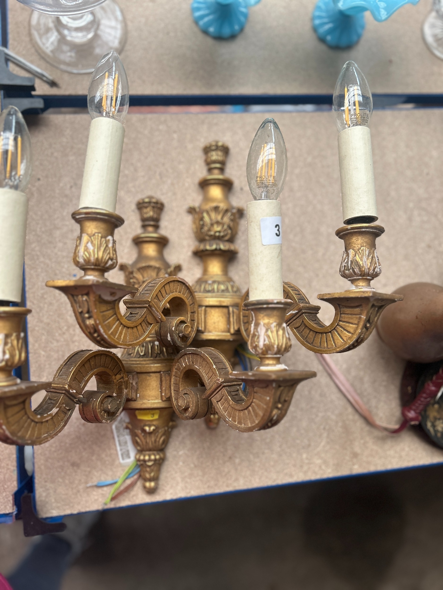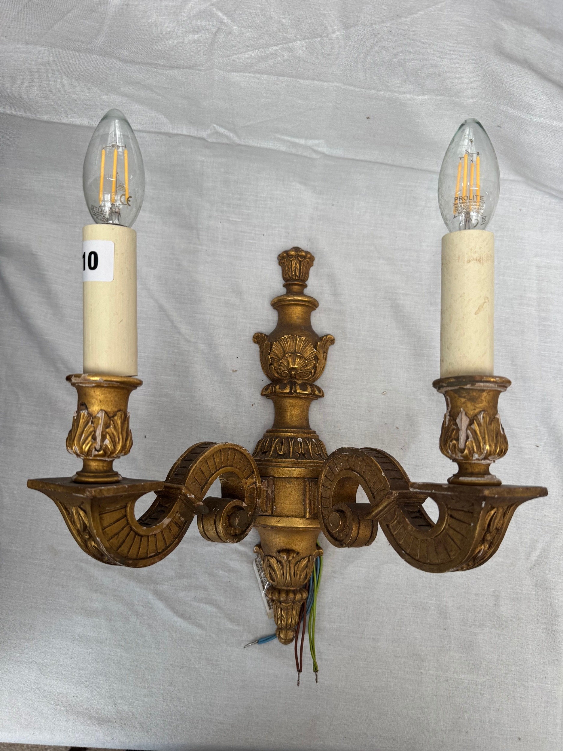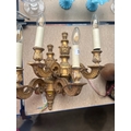 Pair of antique carved and gilt wood twin-branch wall lights, 25cm high