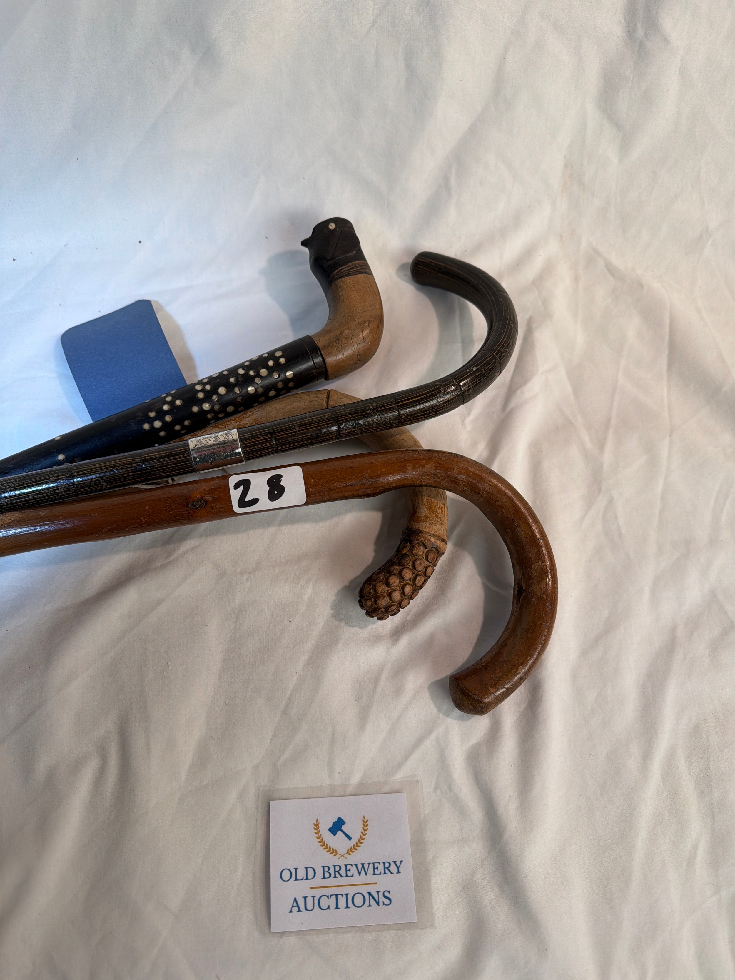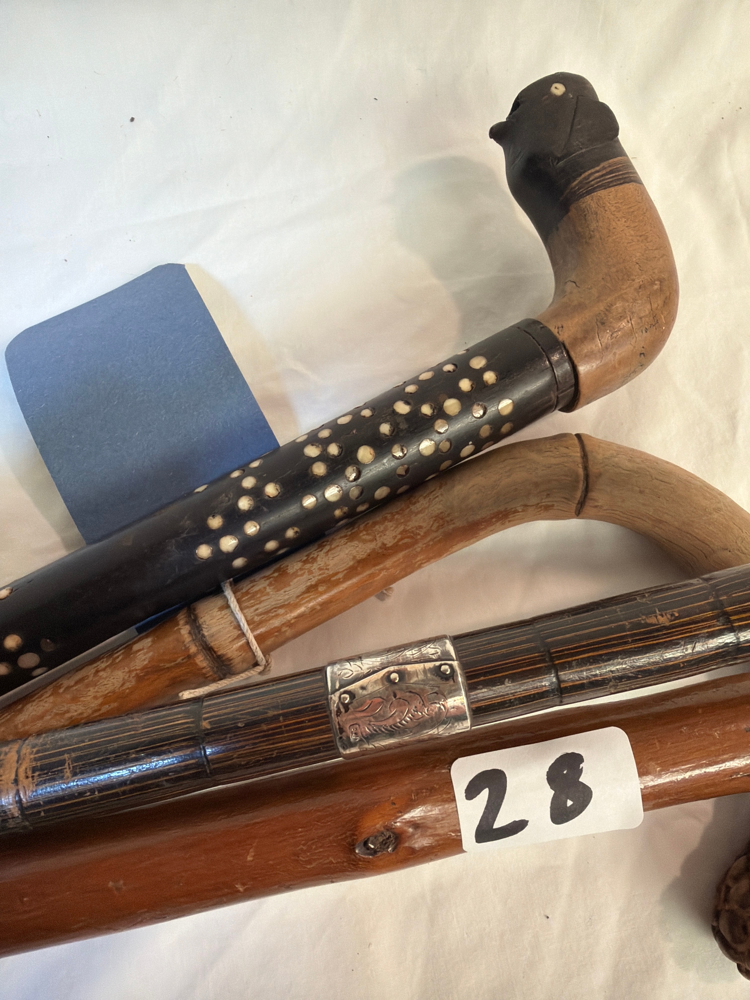 4 well crafted walking sticks with different designs on with silver engraved collar