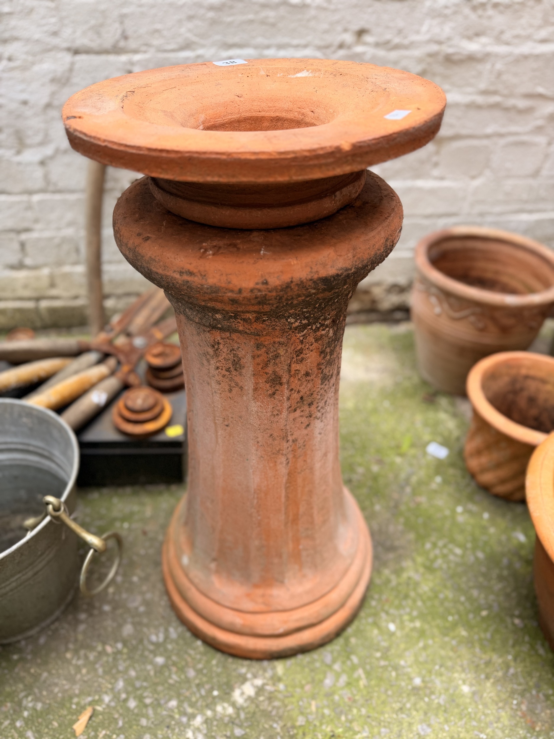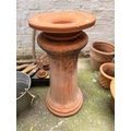 Weathered terracotta garden plinth of taping fluted form with inset socle mount, 68cm high, 31cm diameter, with impressed marks