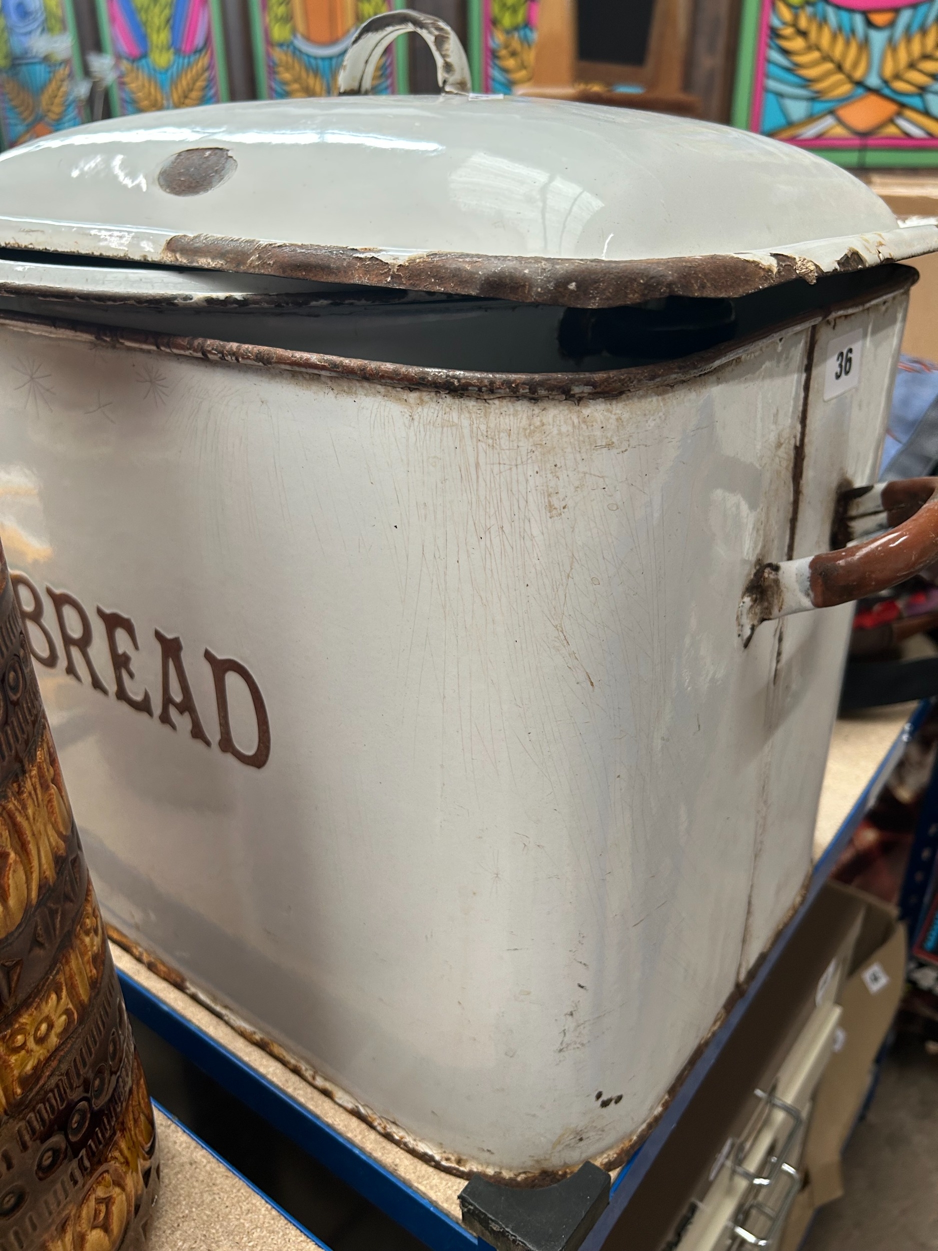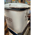 Large antique weathered domestic enamel ‘Bread’ bin and cover and a ‘Flour’ jar and cover (2)