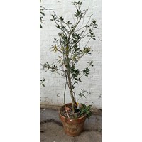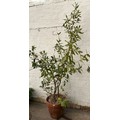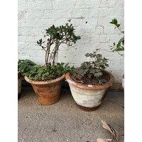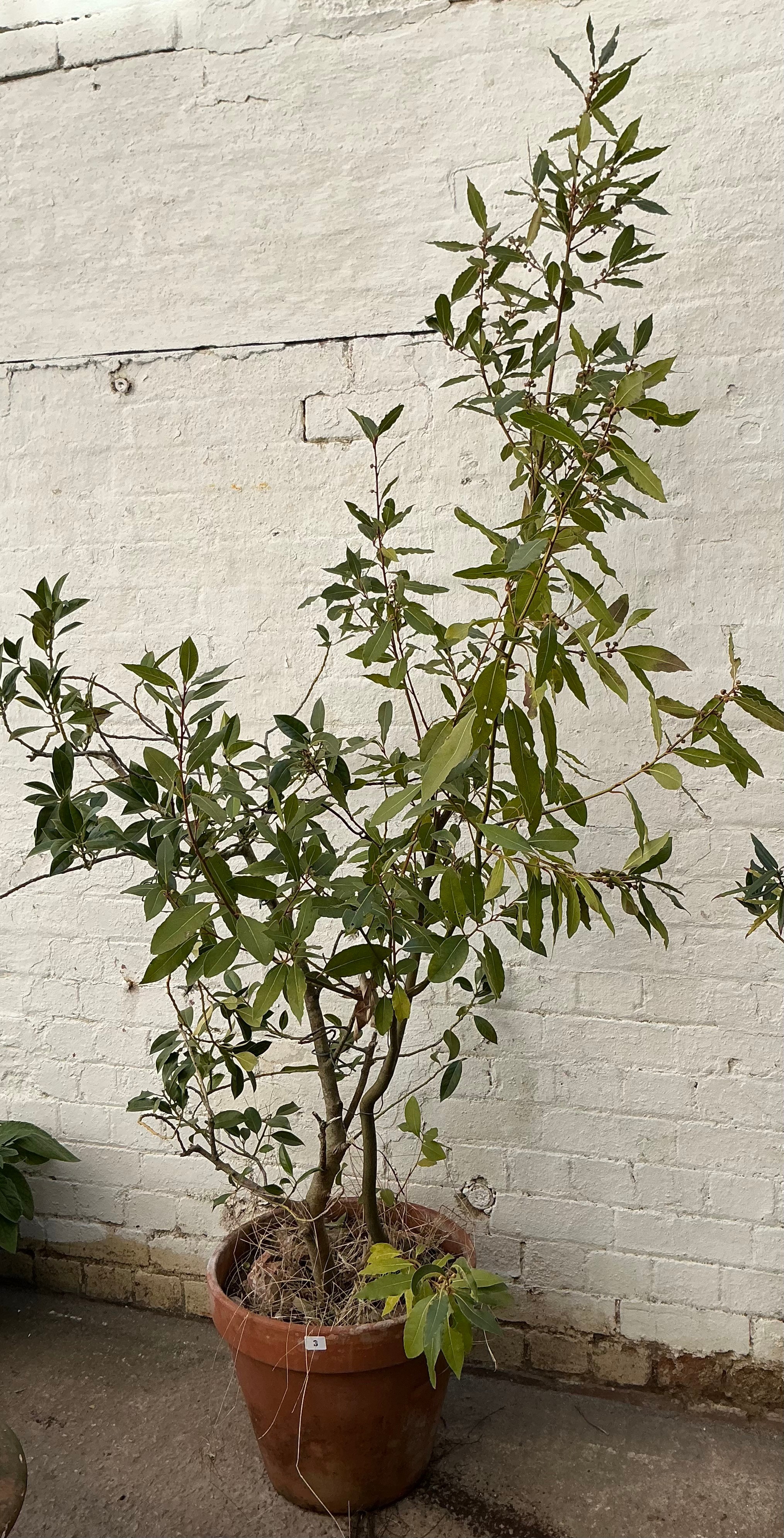 Large weathered terracotta garden pot 37cm high, 44cm diameter, planted with well established bay tree
