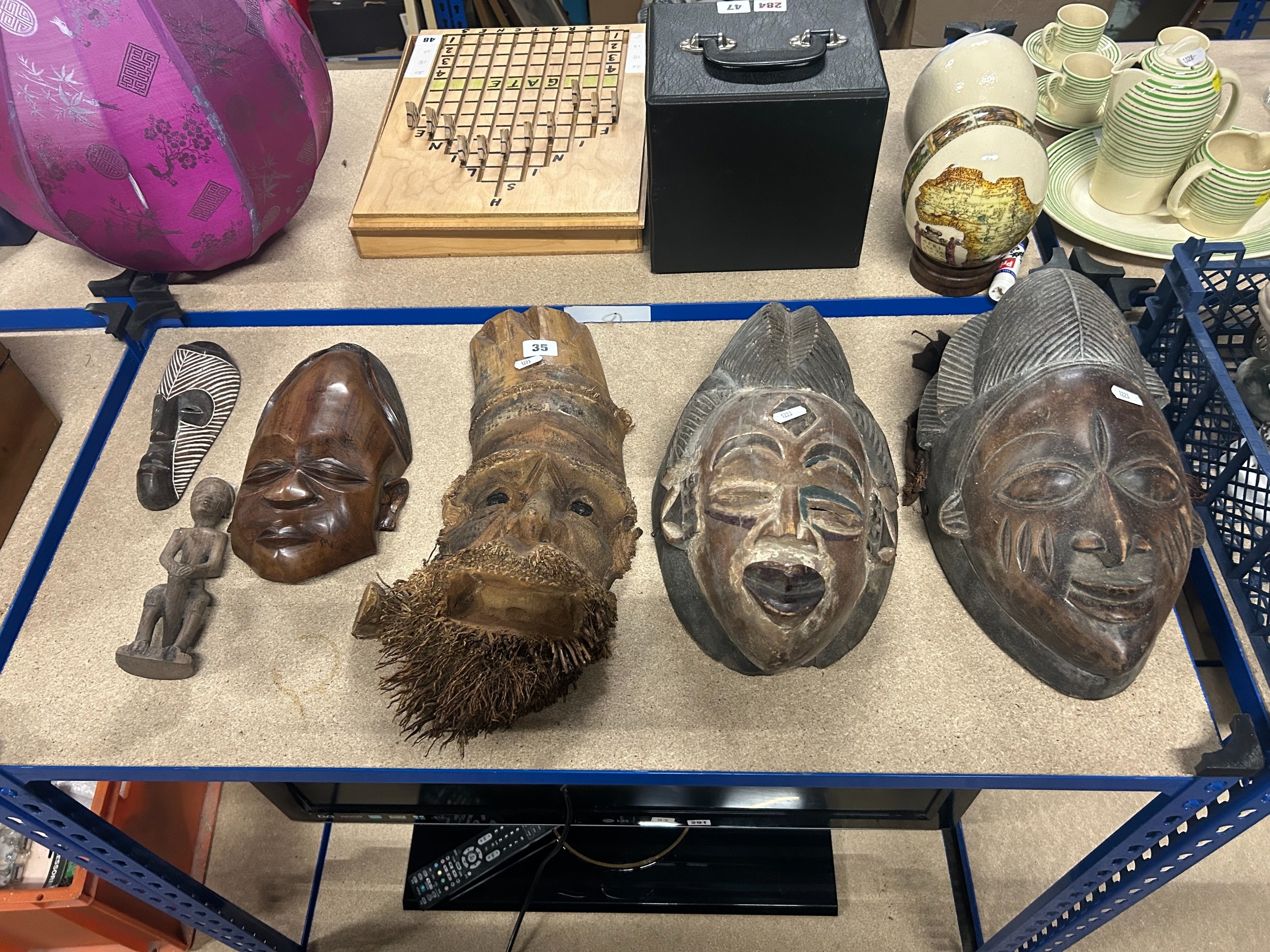 Group of six old carved African carved hardwood masks, wall plaques etc