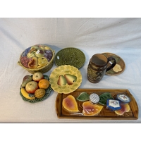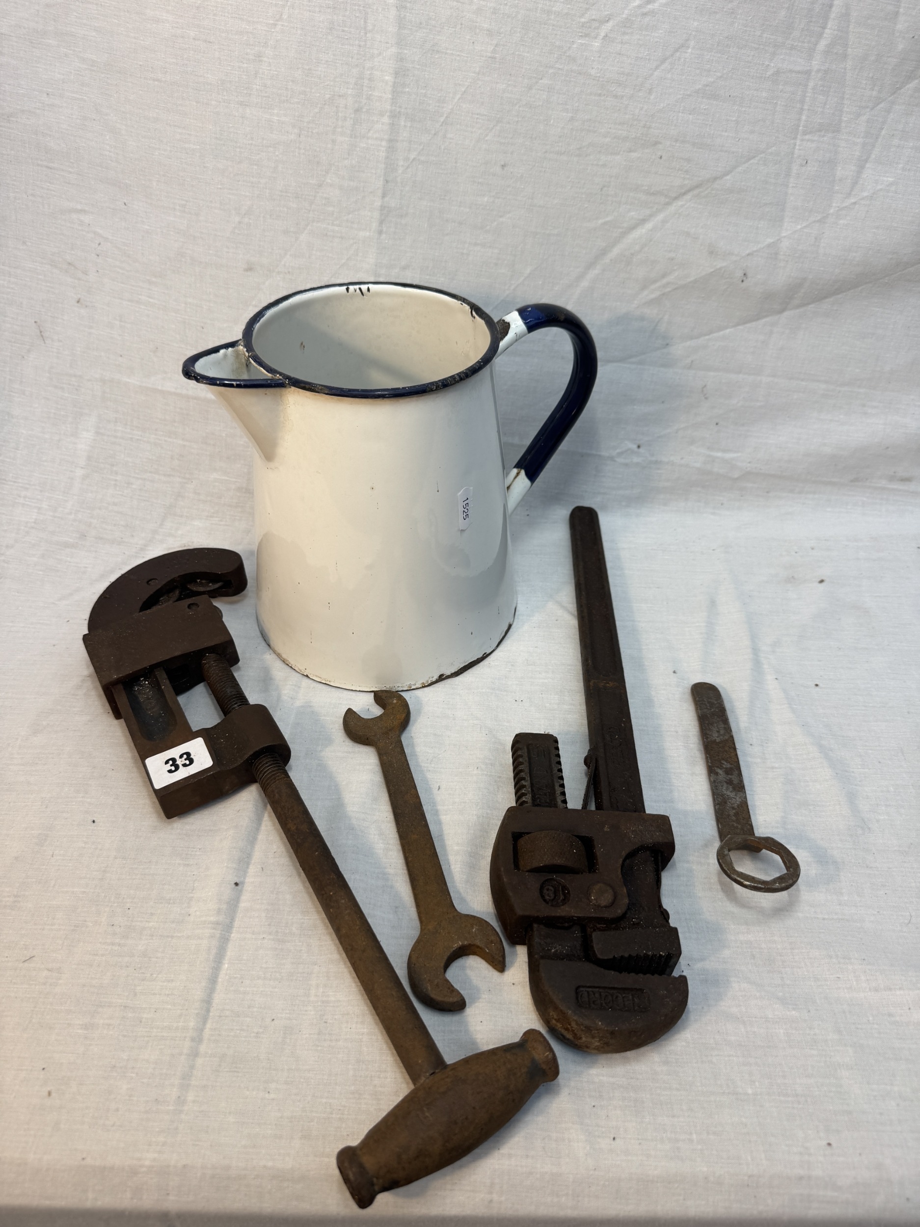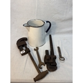 Mixed lot of tools to include record pipe cutter etc and a large vintage enamel jug.
