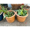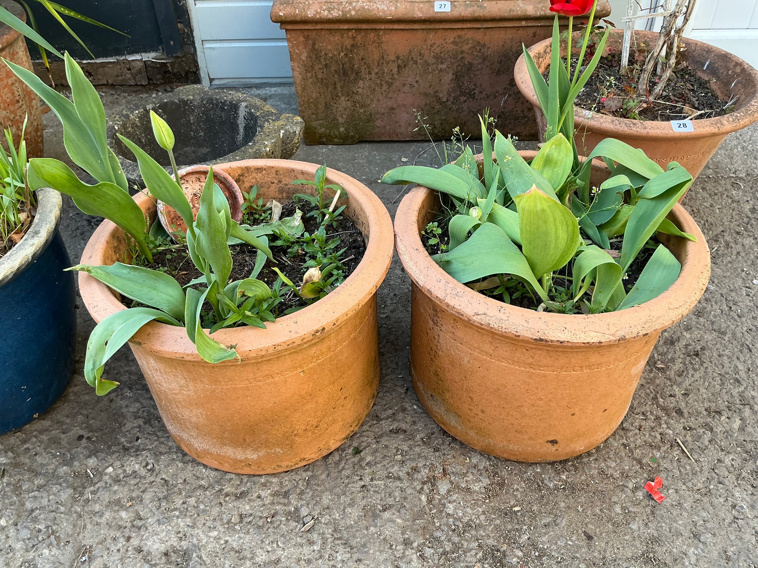 Pair of weathered ‘Yorkshire Flower Pots’ plant pots, each planted with tulips, 32cm high, 40cm diameter (2)