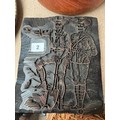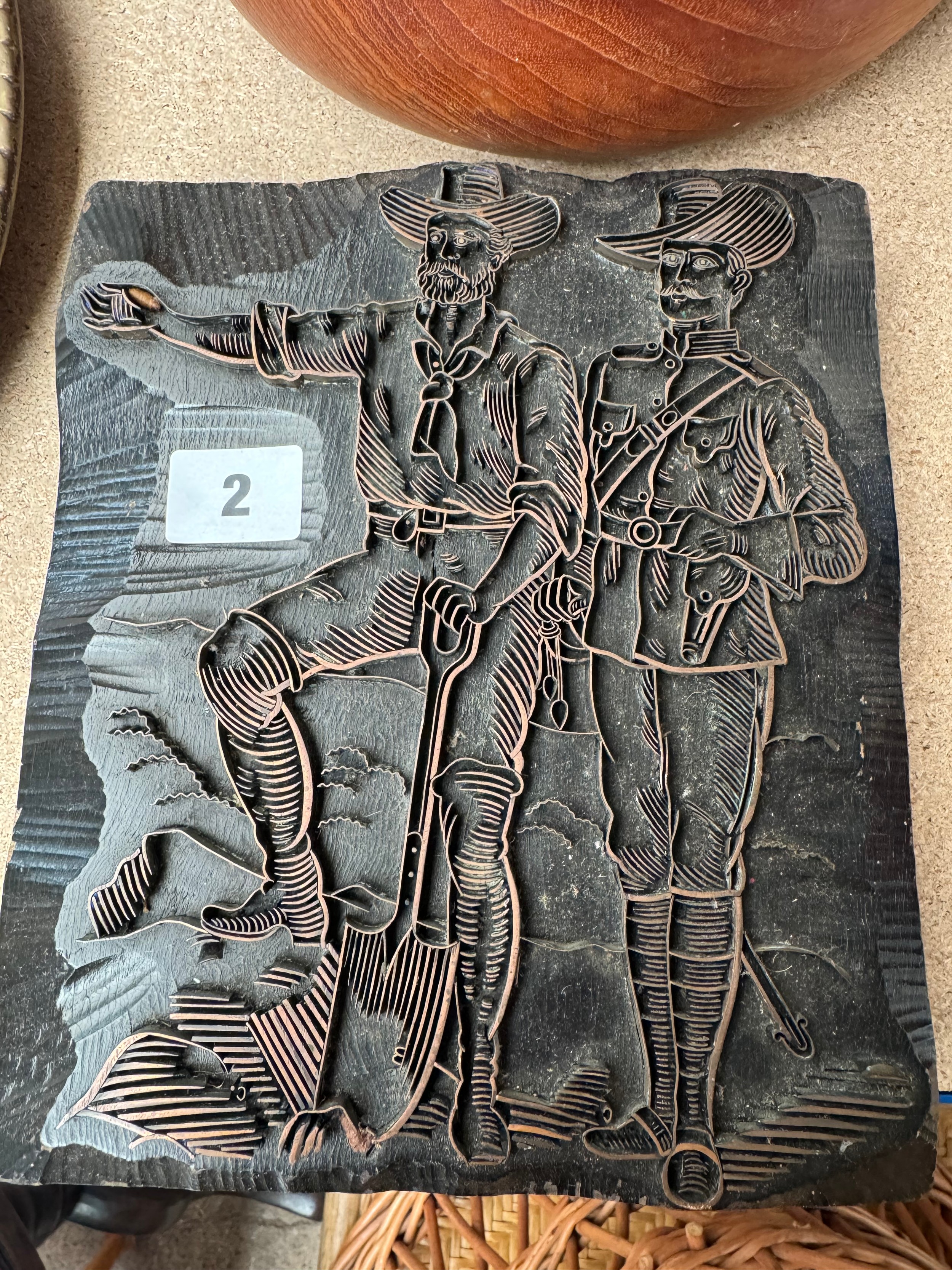 Unusual old carved wooden and copper framed printing block, design of American officer / prospector, 23 x 19cm