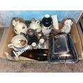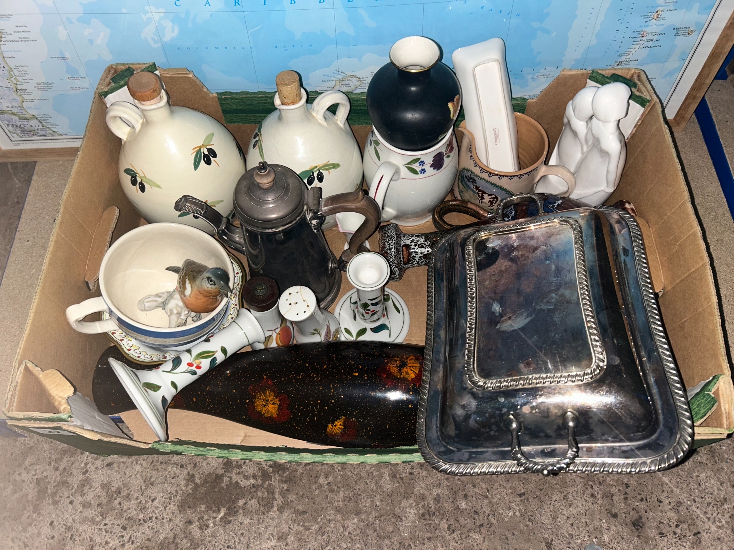 Mixed decorative collection, ceramics and silver plated wares to include olive oil jars, Doulton figures, candlesticks etc