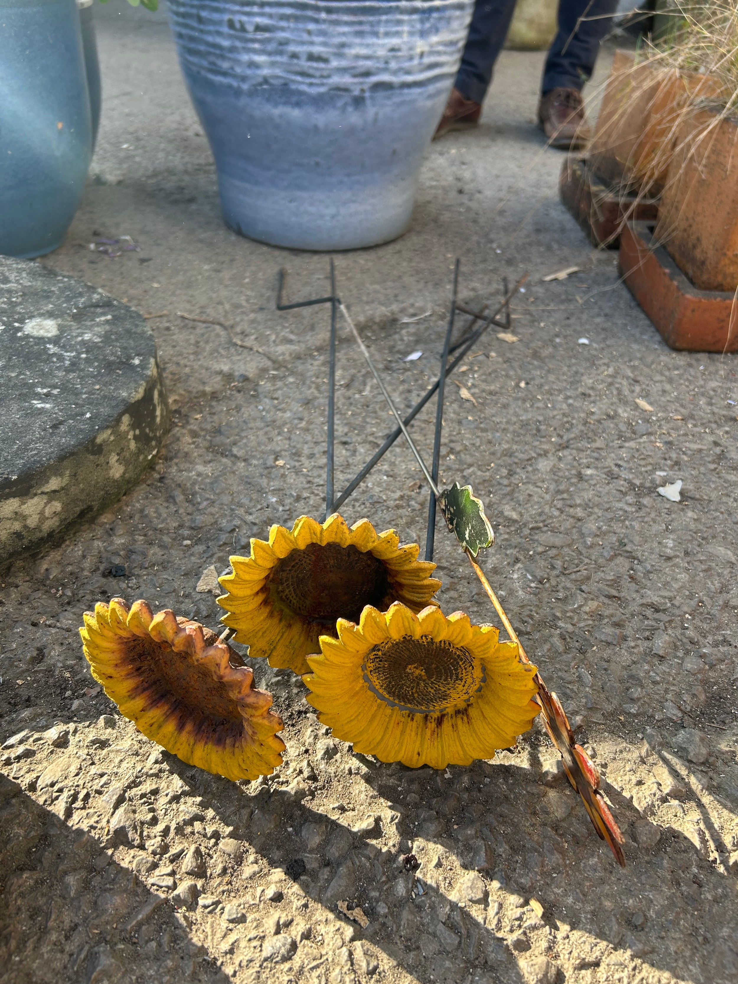 Three weathered metalwork garden sunflower ornaments and another (4)