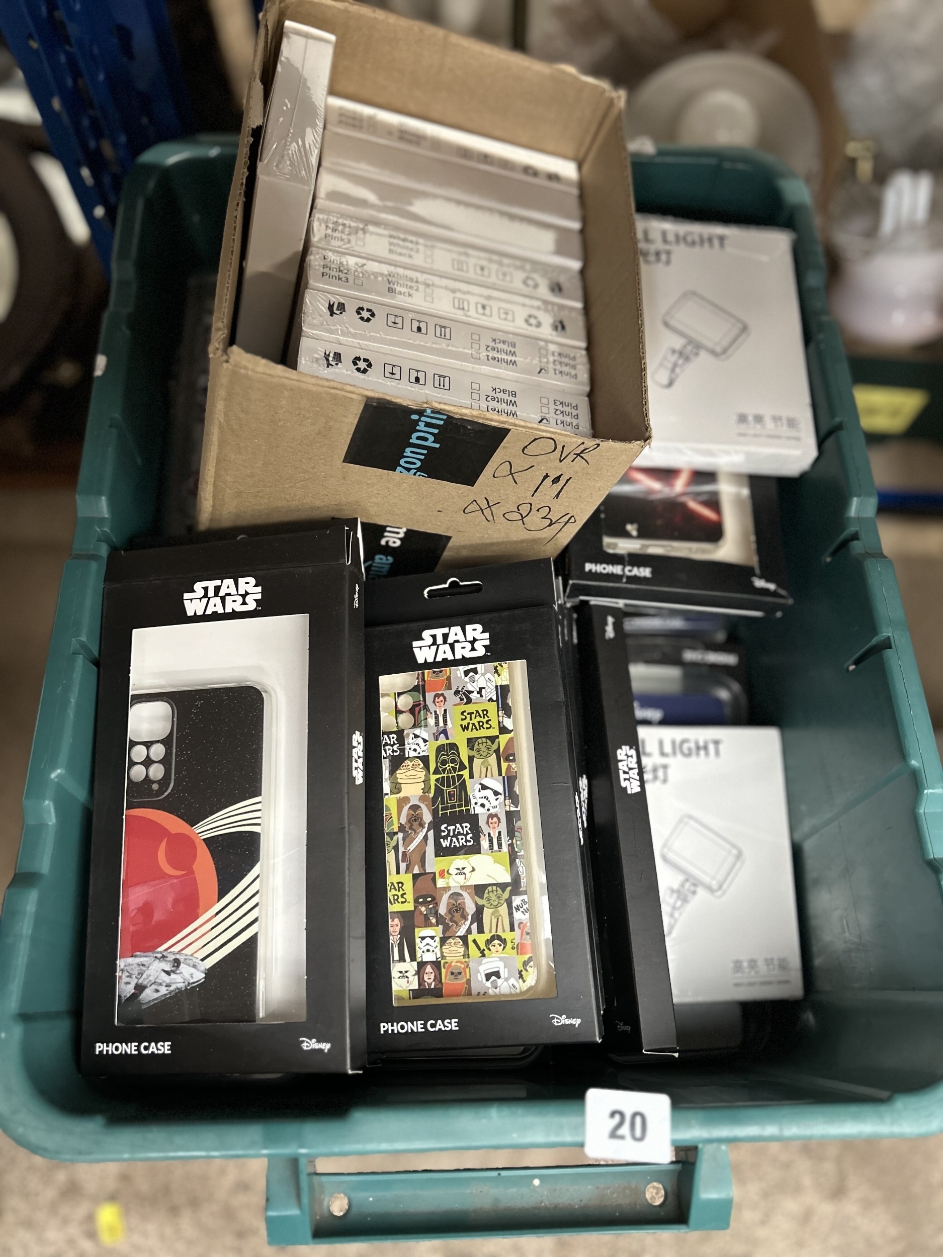 Large box lot, Disney and Marvel themed smartphone cases and a box of unopened smartphone ‘Selfie Lights’