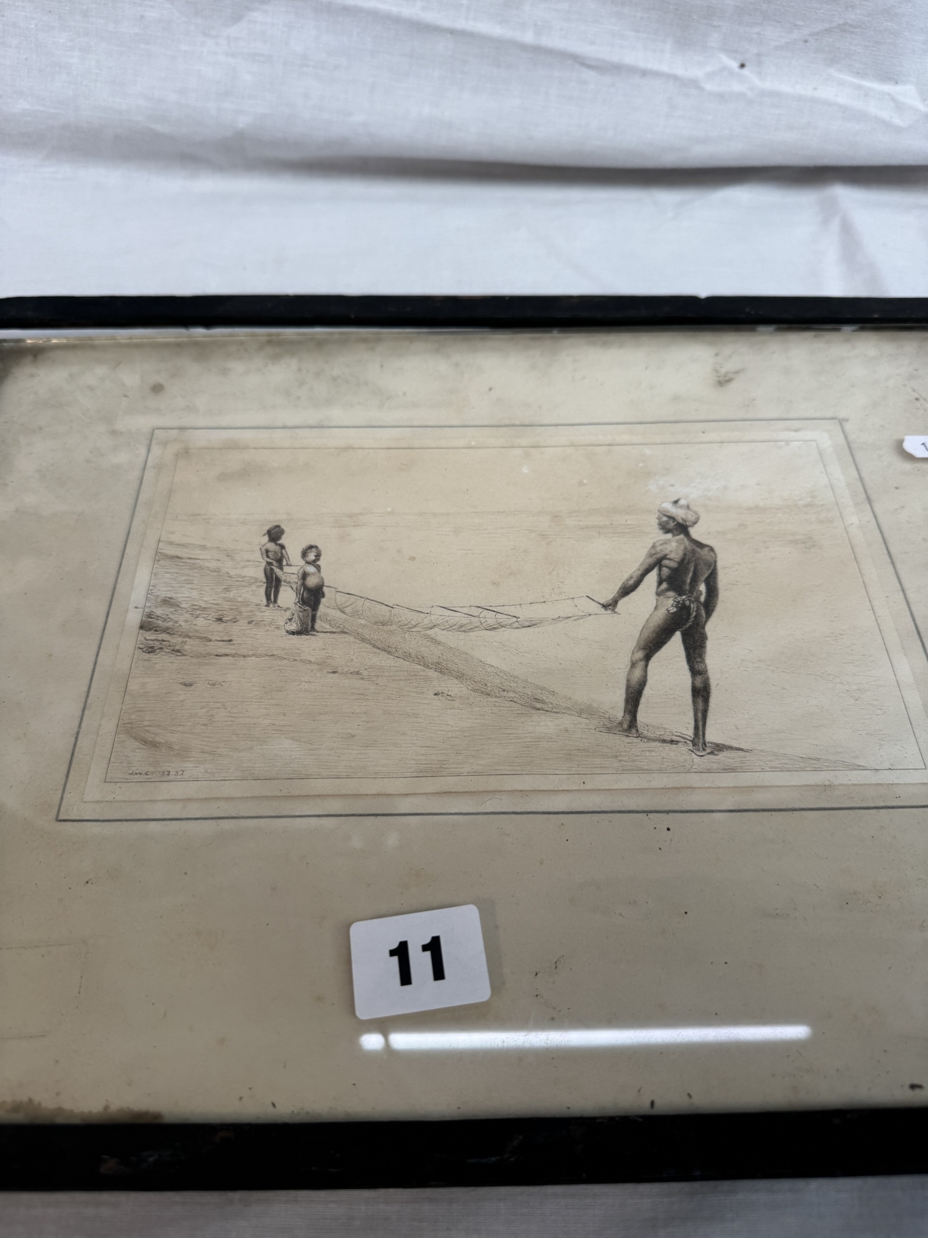 Framed etching depicting an African male fishing with two children signed J.W.C lower left