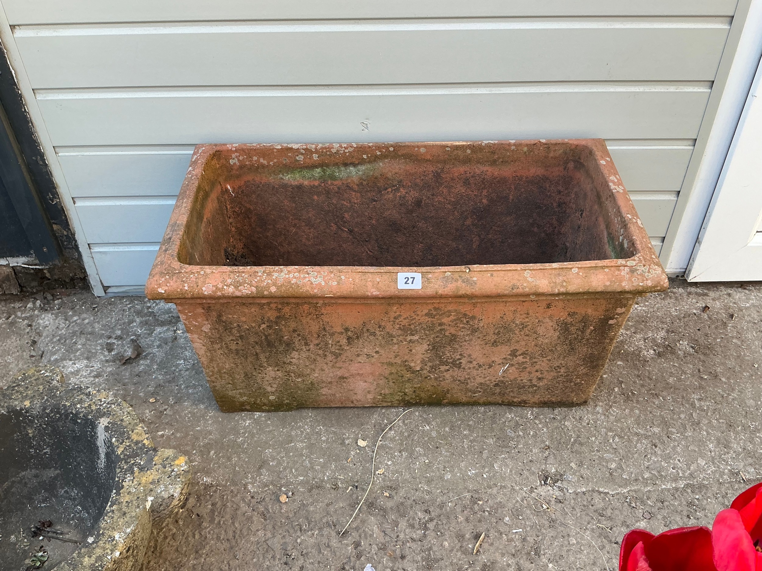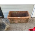 A weathered terracotta garden planter of rectangular form, 34cm high, 68 x 35cm