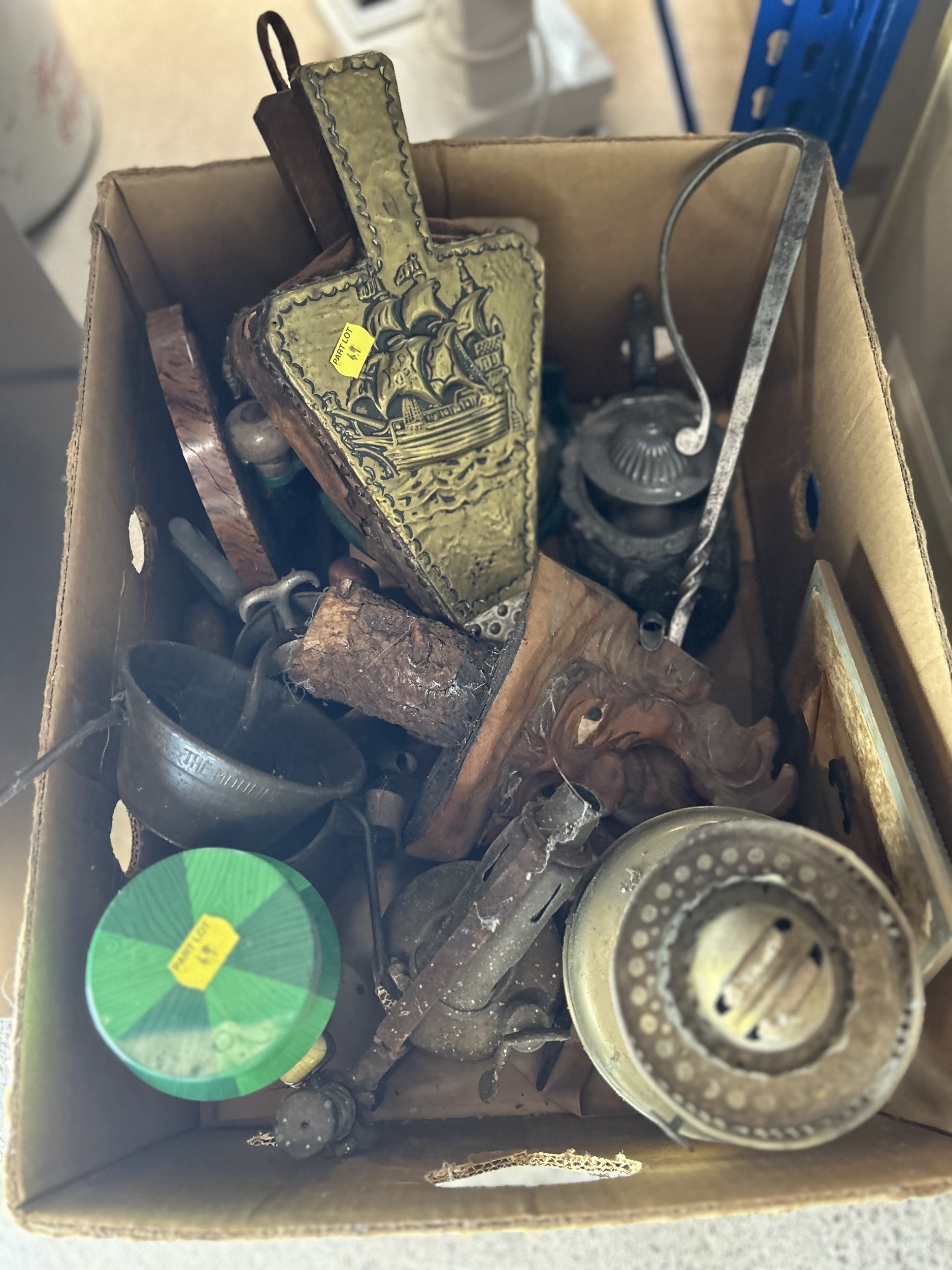 Interesting miscellaneous lot to include Bakelite solitaire board, vintage blow torch, fireside bellows, vintage kitchen accessories, treen etc