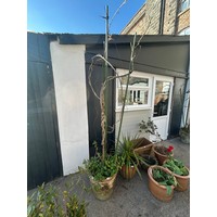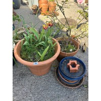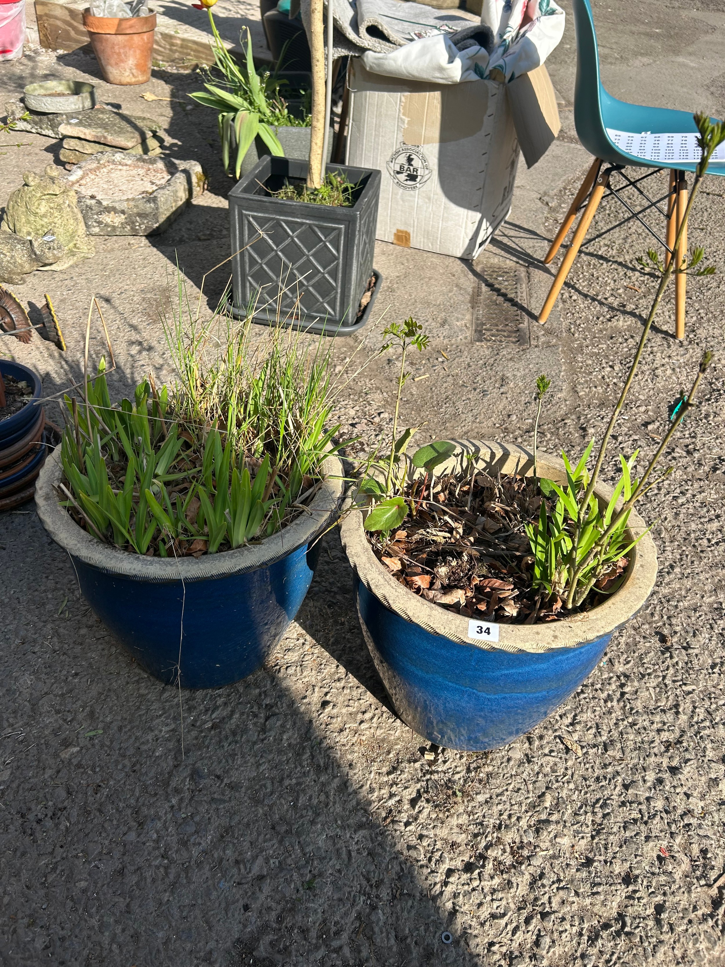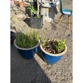 Pair weathered blue glazed garden plant pots, combed rims, planted, 32 x 38cm (2)