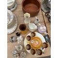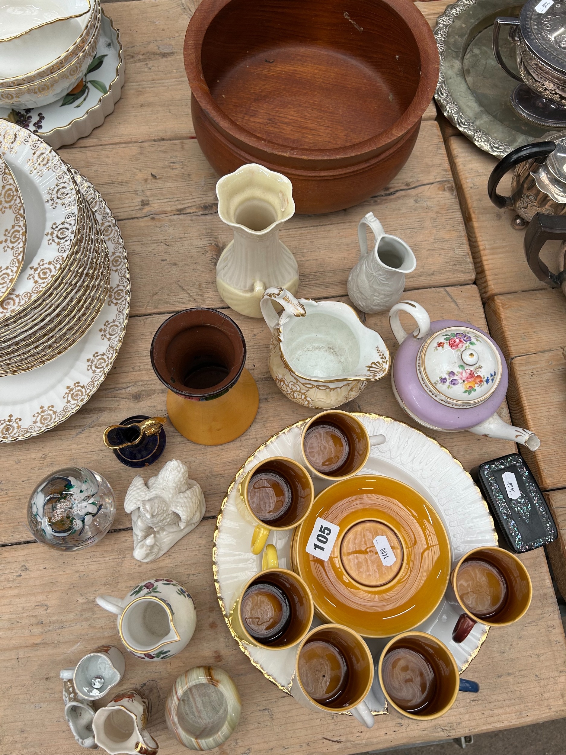 Mixed decorative ceramics to include coffee cans and saucers, Belleek and other examples, a papier mache snuff box, signed glass paperweight, etc