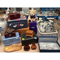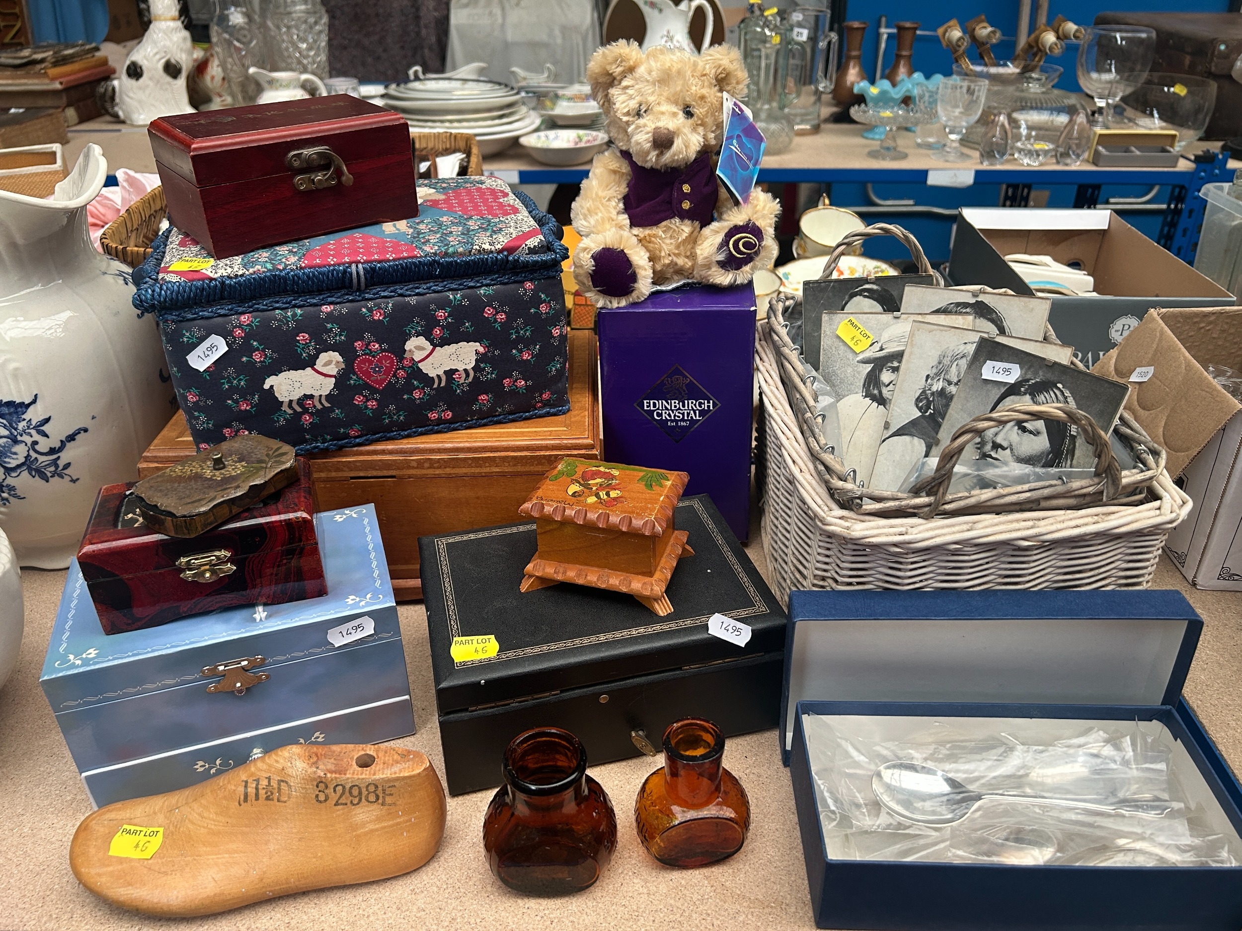 Interesting mixed lot, vintage and later jewellery boxes to include lacquered and musical examples, black and white photographs of Native American chiefs to include White Horse, Ten Bears, Geronimo, boxed Edinburgh crystal vase, Cadbury teddy bear, etc