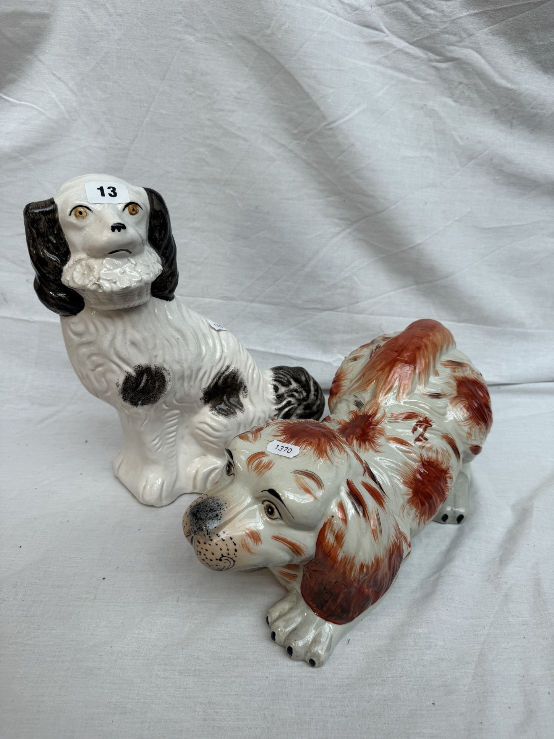 2 staffordshire dogs, one uncommon style in the ready to play position.