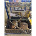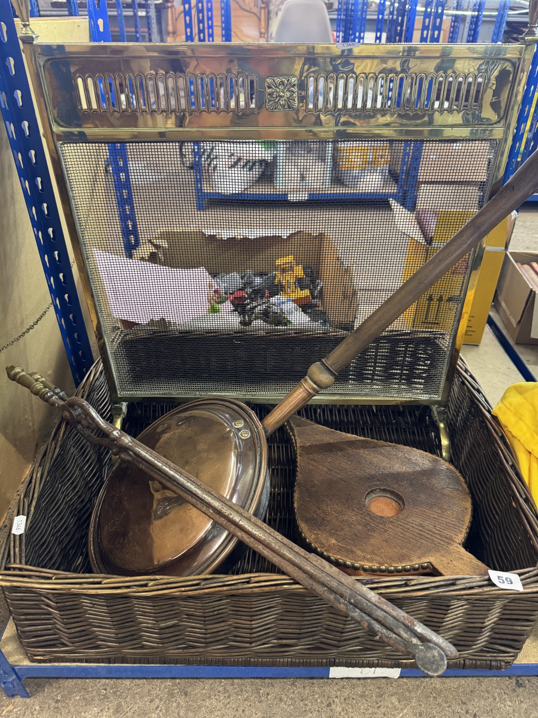 Mixed lot of fireside items to include a brass fire screen, wicker log basket, etc.