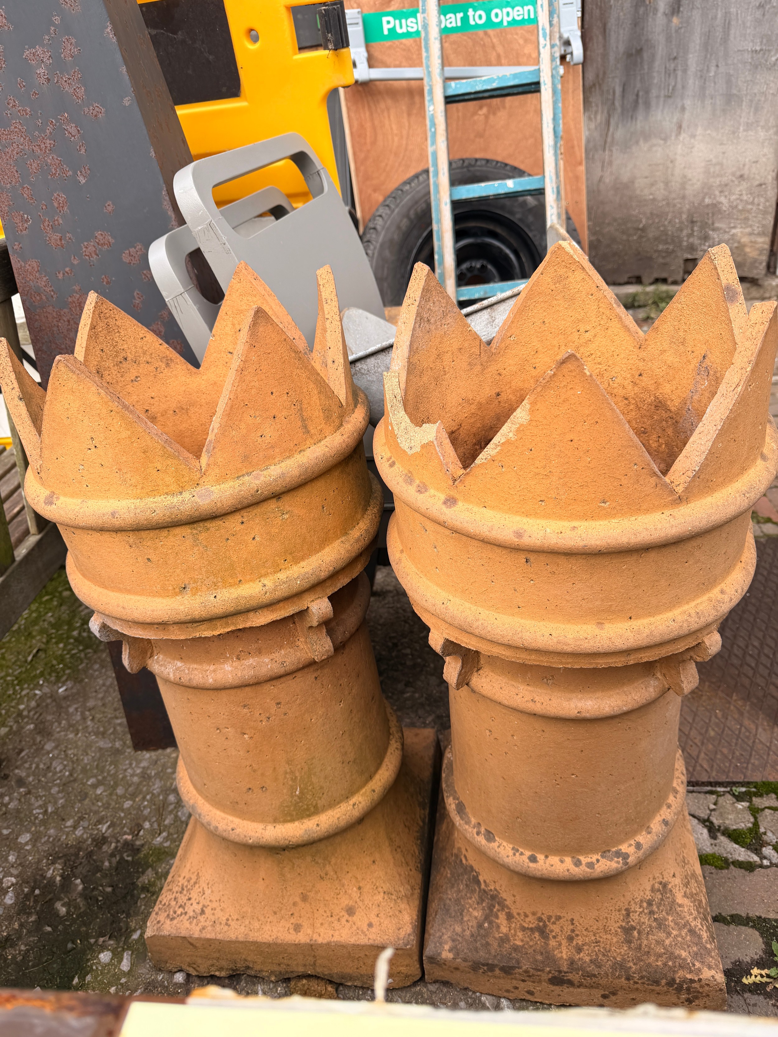 Two vintage weathered crown shaped chimneys