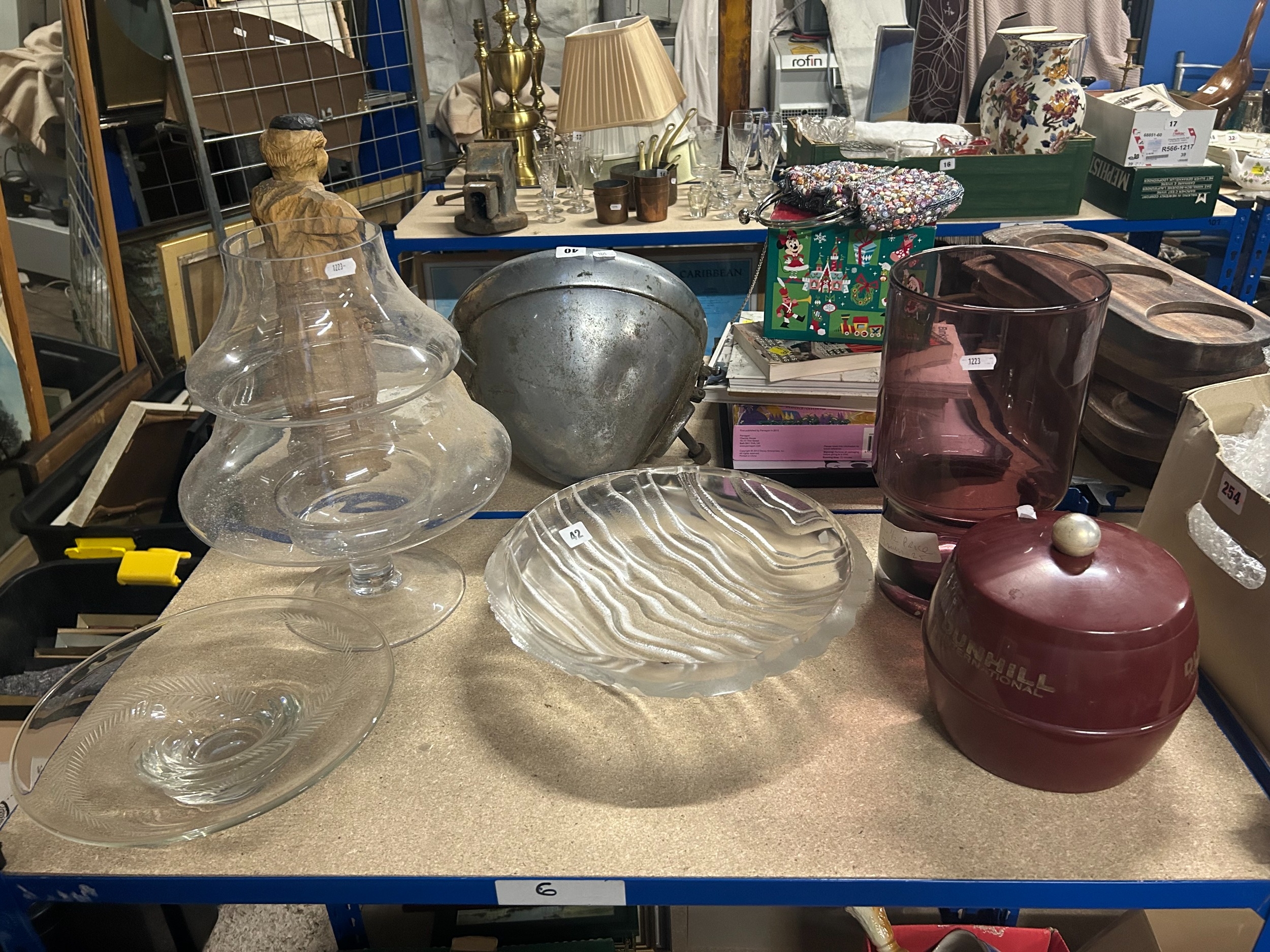 Mixed good quality glass wares to include a large confectioner’s (?) glass vase, 38cm high, heavy Darlington crystal shallow bowl, large amethyst vase and a vintage ‘Dunhill International’ ice cooler and cover (5)