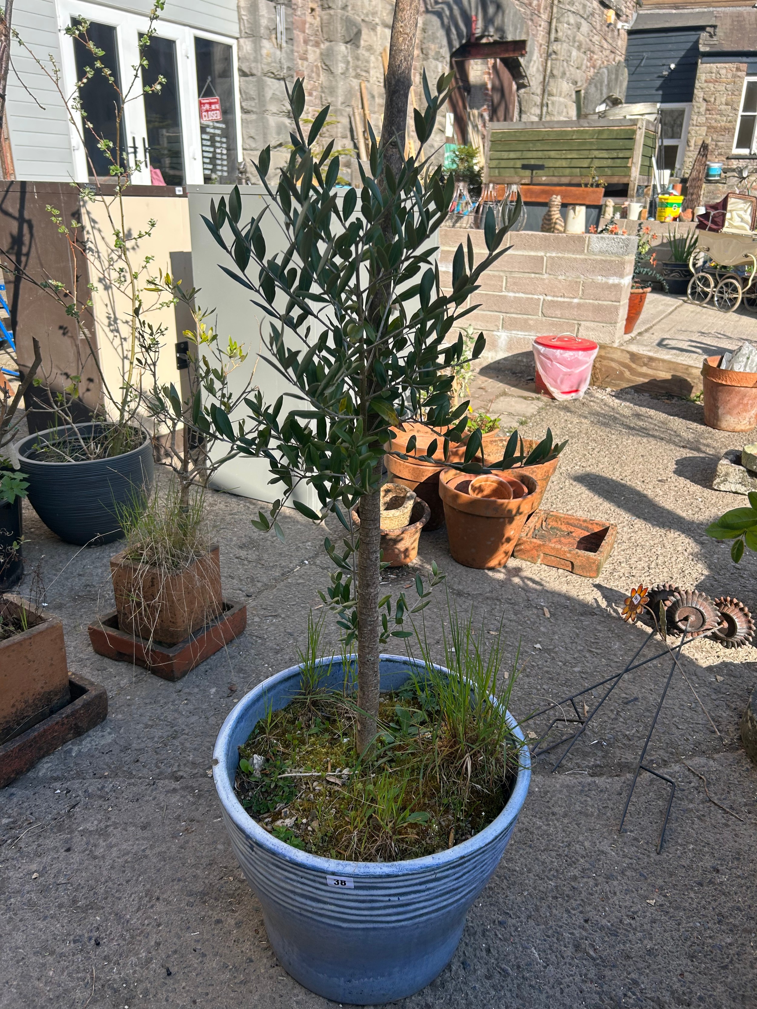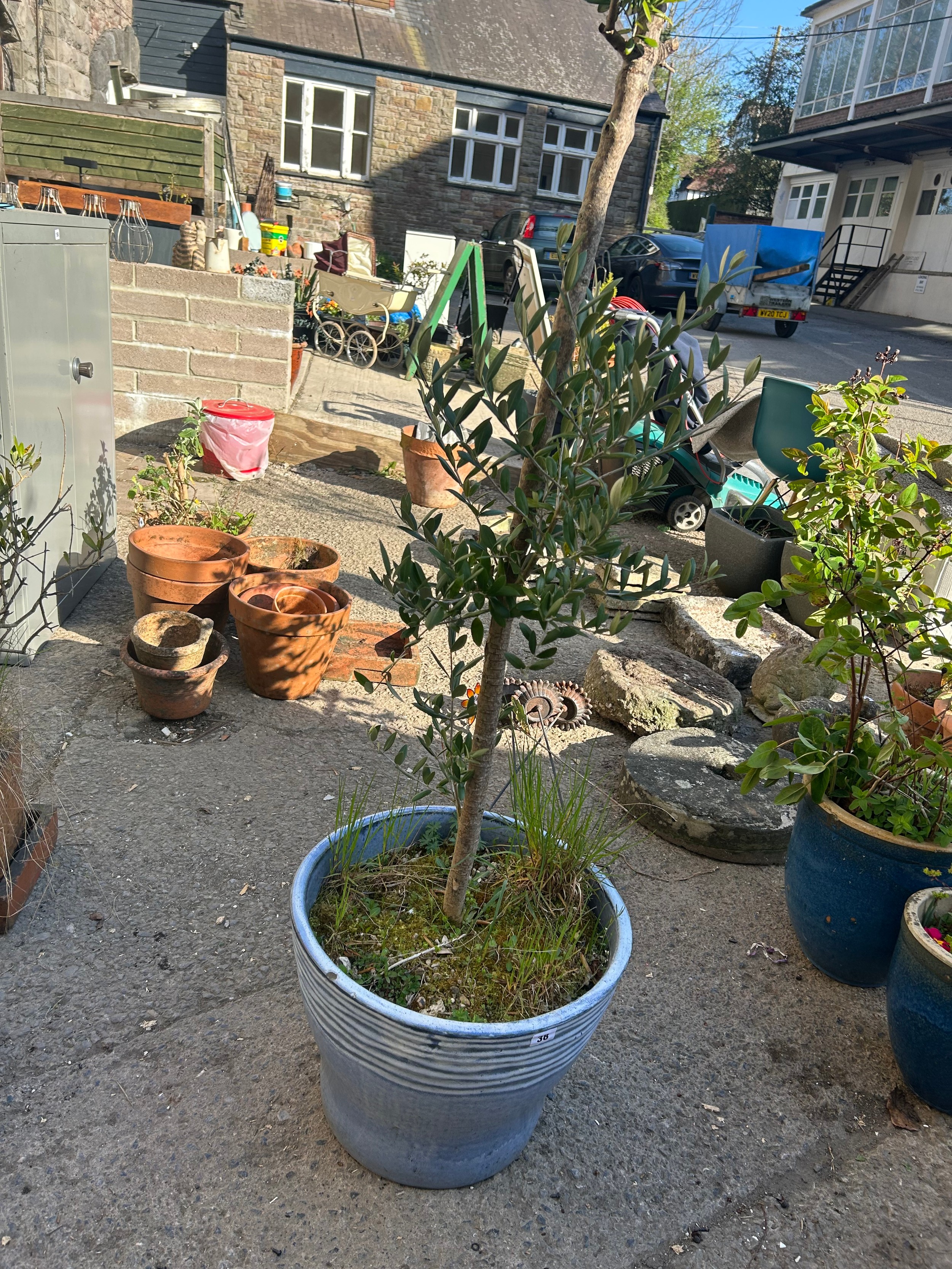 Large pale blue glazed garden pot planted with a well established olive tree, 33 x 44cm