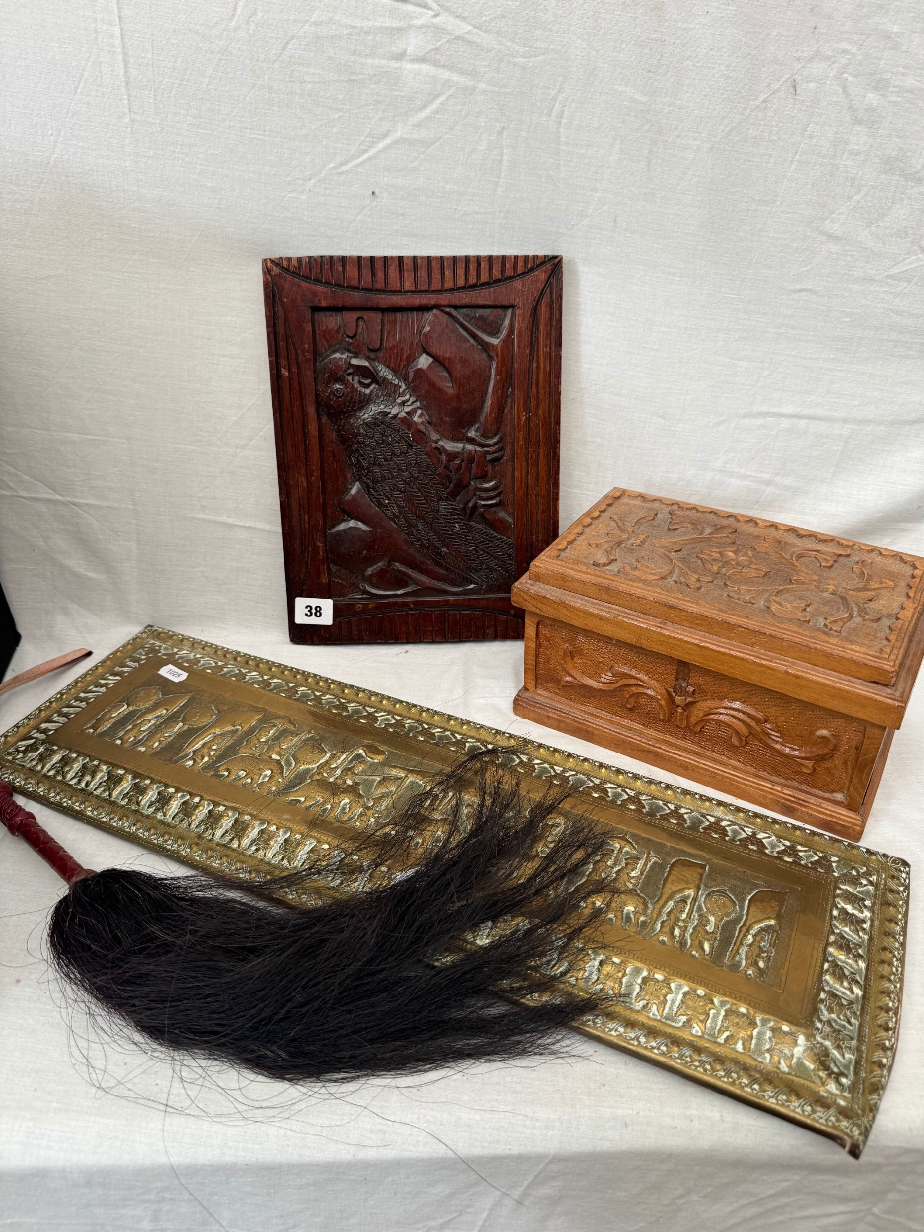 Old Eastern brass embossed panel, 19 x 60cm, carved wooden box with hinged cover, fly whisk and a carved hardwood panel etc