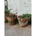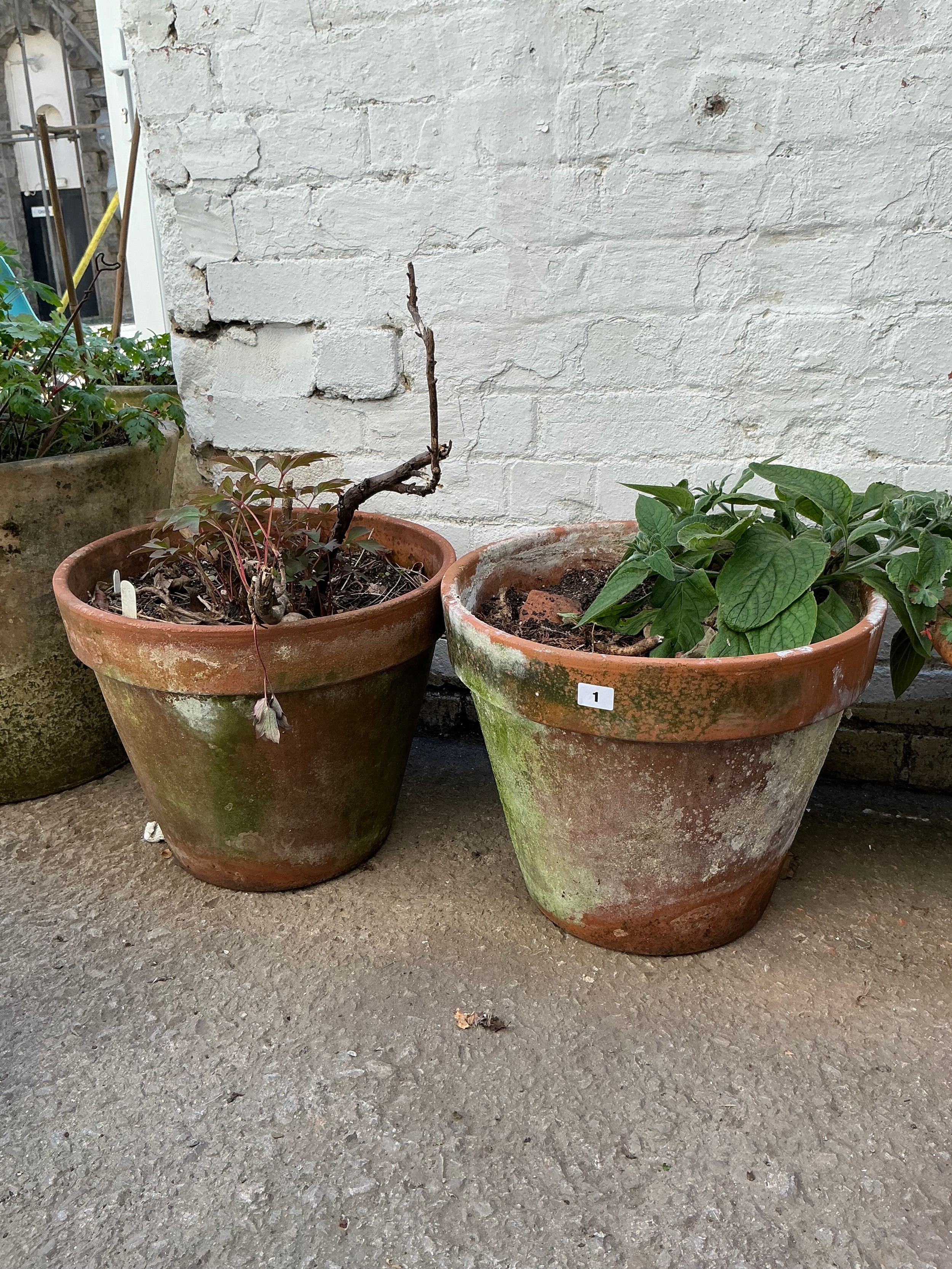Pair of weathered and planted terracotta garden pots, 35cm high, 33cm diameter (2)