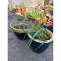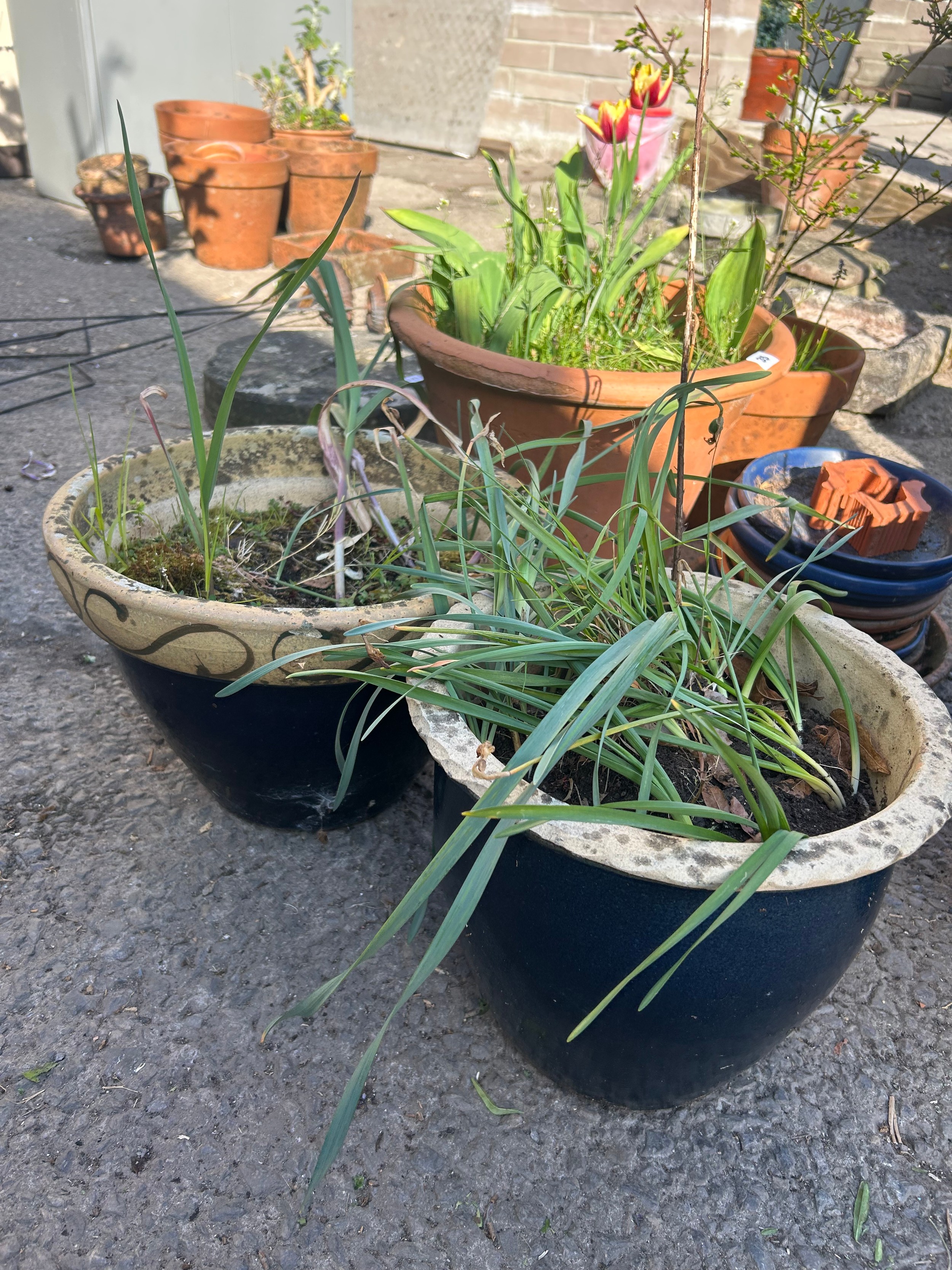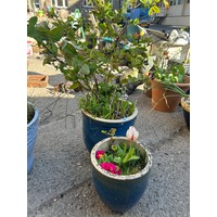 Two weathered dark blue glazed garden plant pots, the largest 26cm high, 38cm diameter, both planted (2)