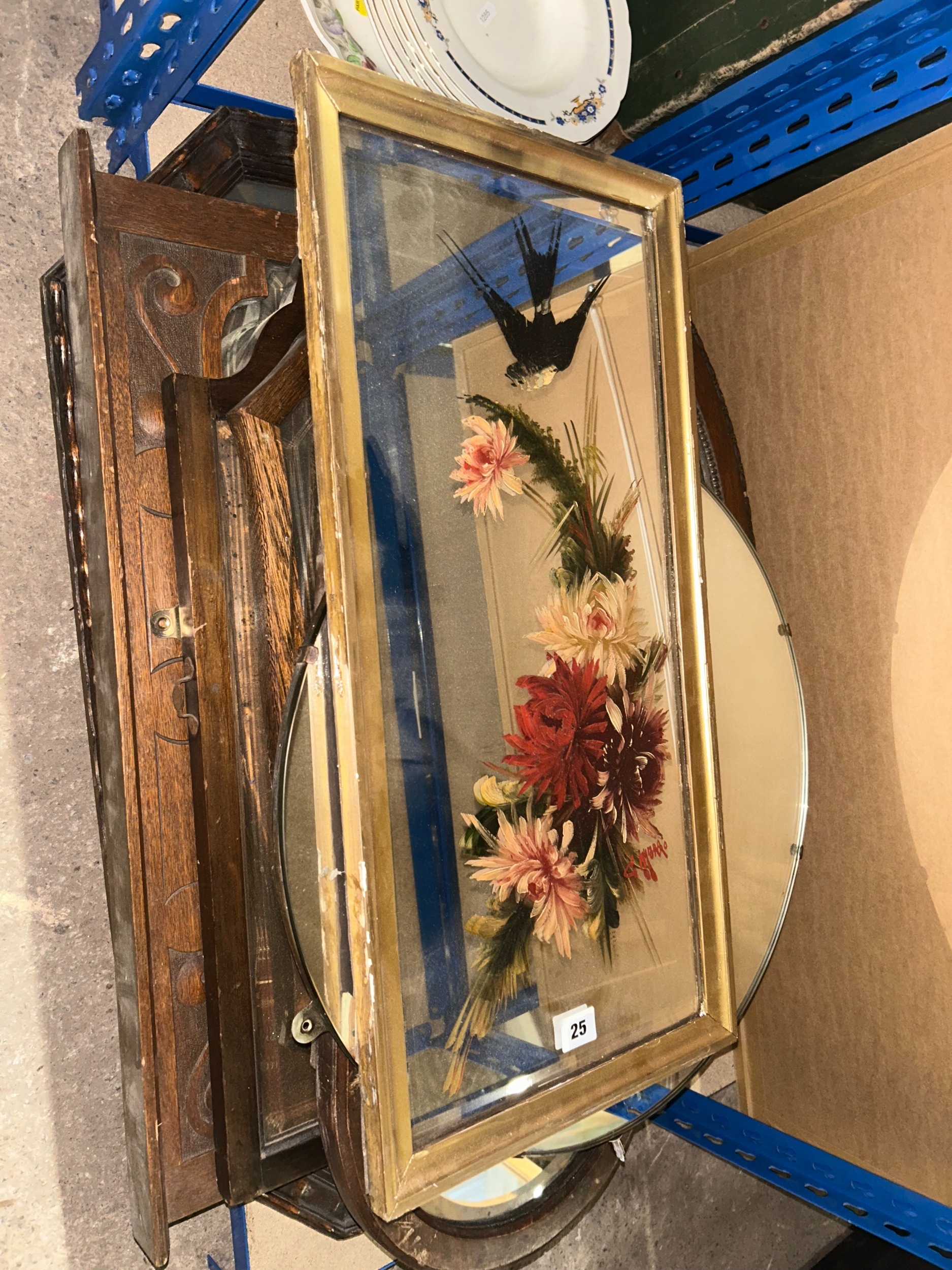 Group of vintage oak framed wall mirrors and others to include etched and painted examples
