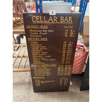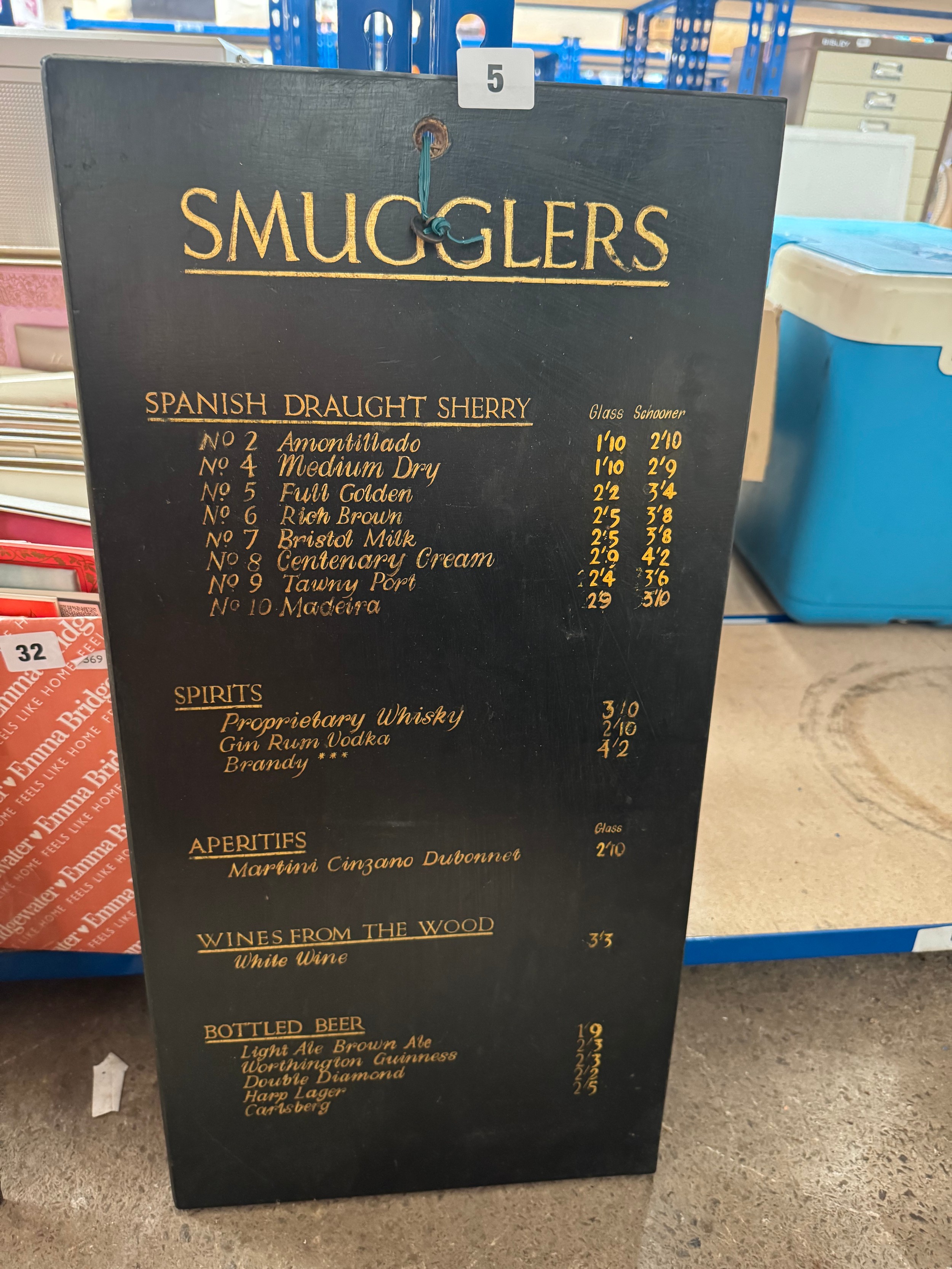 ‘Smugglers’, old early 20th century drinks price board, hand gilded on board, believed to originate from Bristol, 61 x 30cm