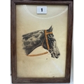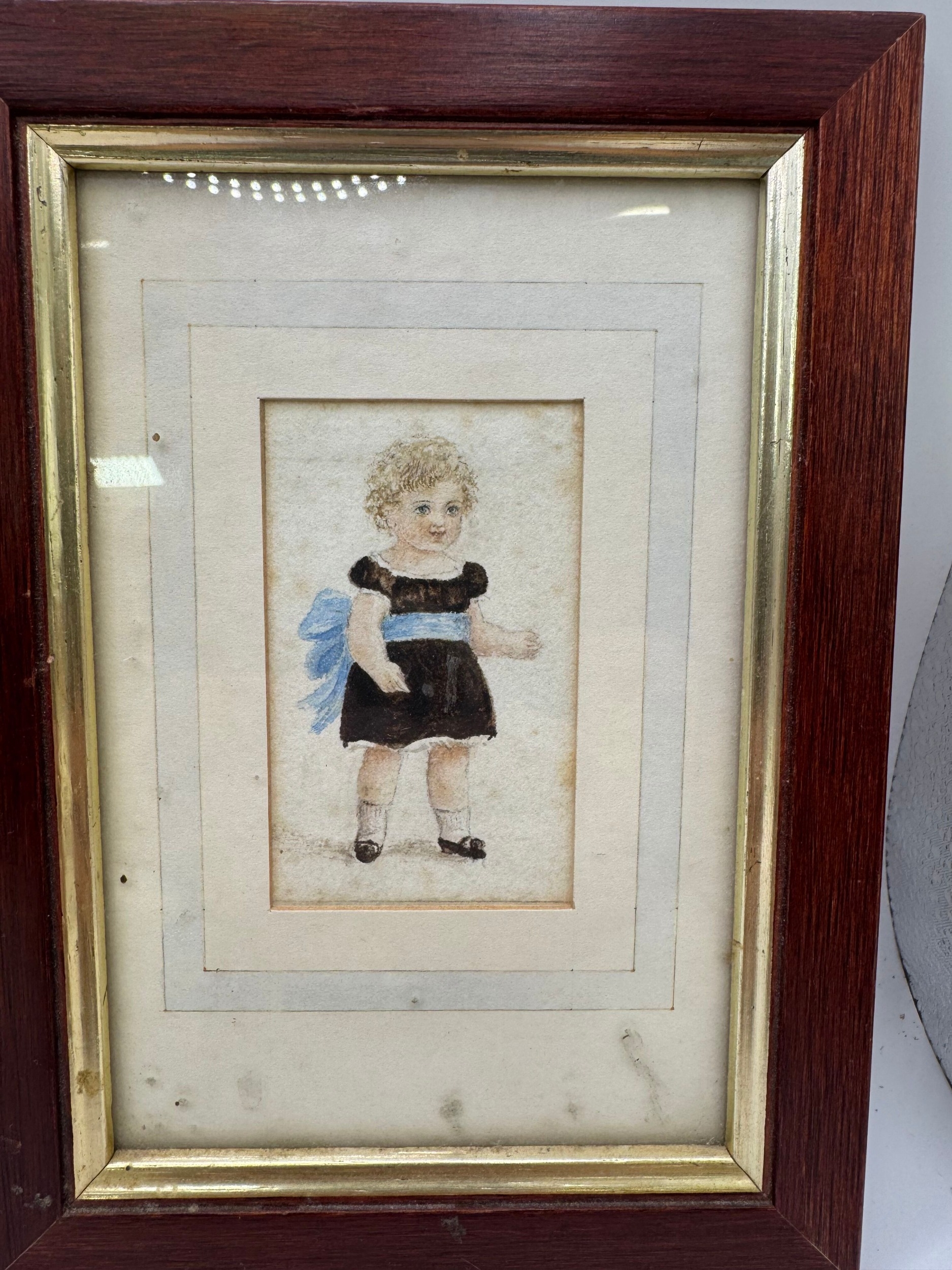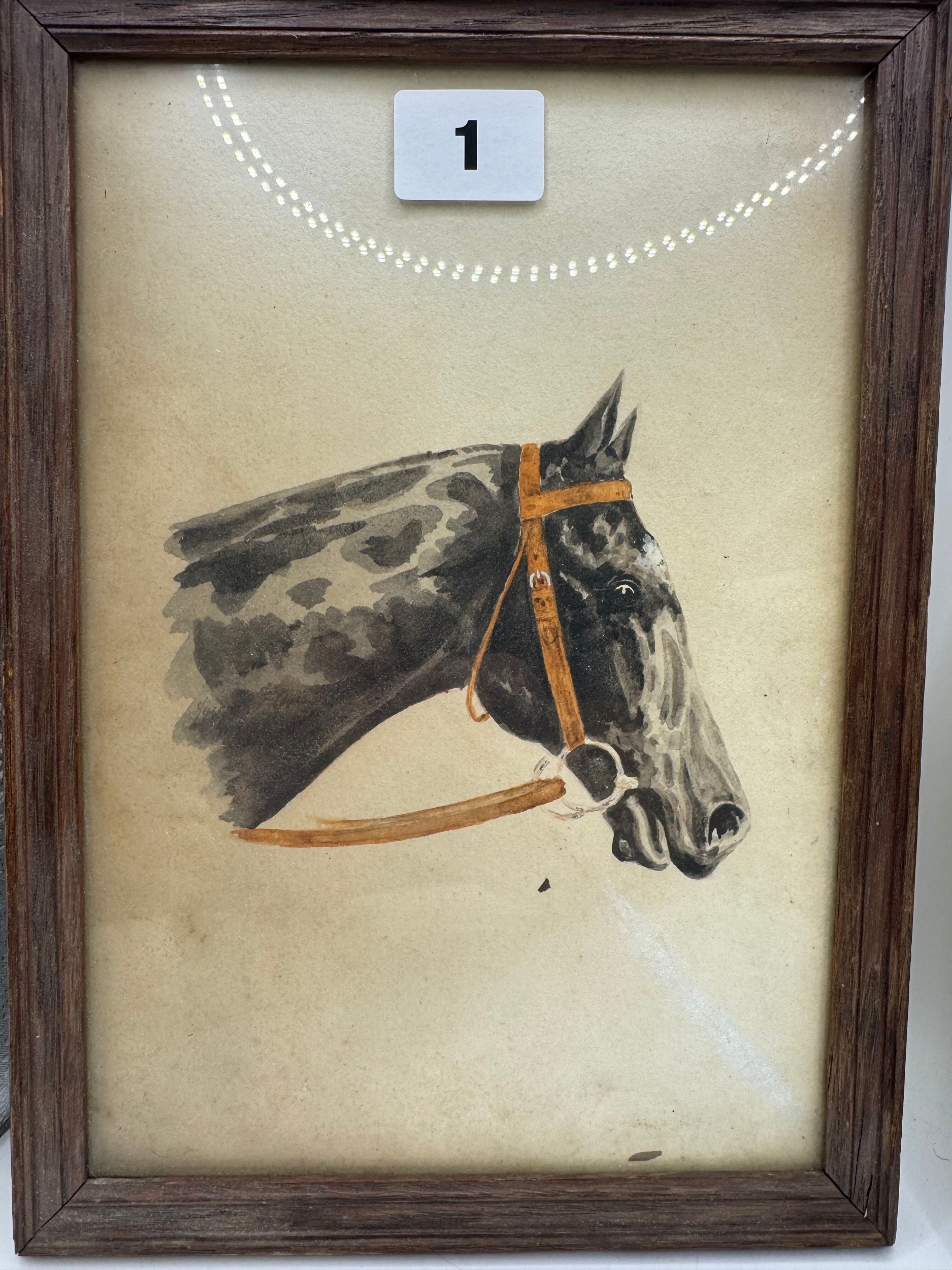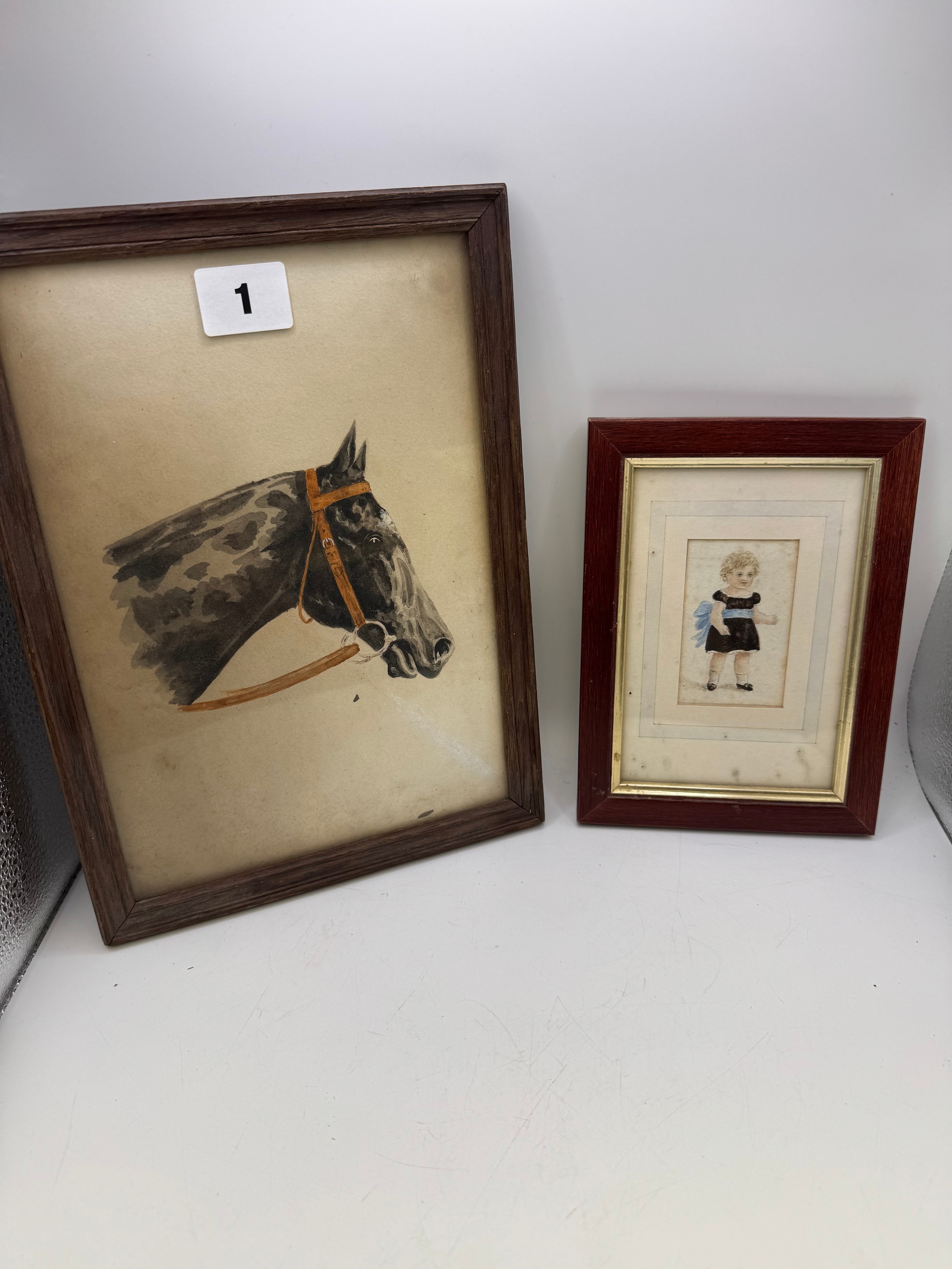 Edwardian portrait of a horse, watercolour on paper, framed and glazed, French gallery label verso, 27 x 19.5cm, together with watercolour full length portrait miniature, study of an infant, labelled verso ‘Original Victorian Watercolour by Edith M Booth’, circa 1880, inscribed Benedict James Dalrymaple Born 1 Jan 1883’, 18 x 13cm