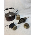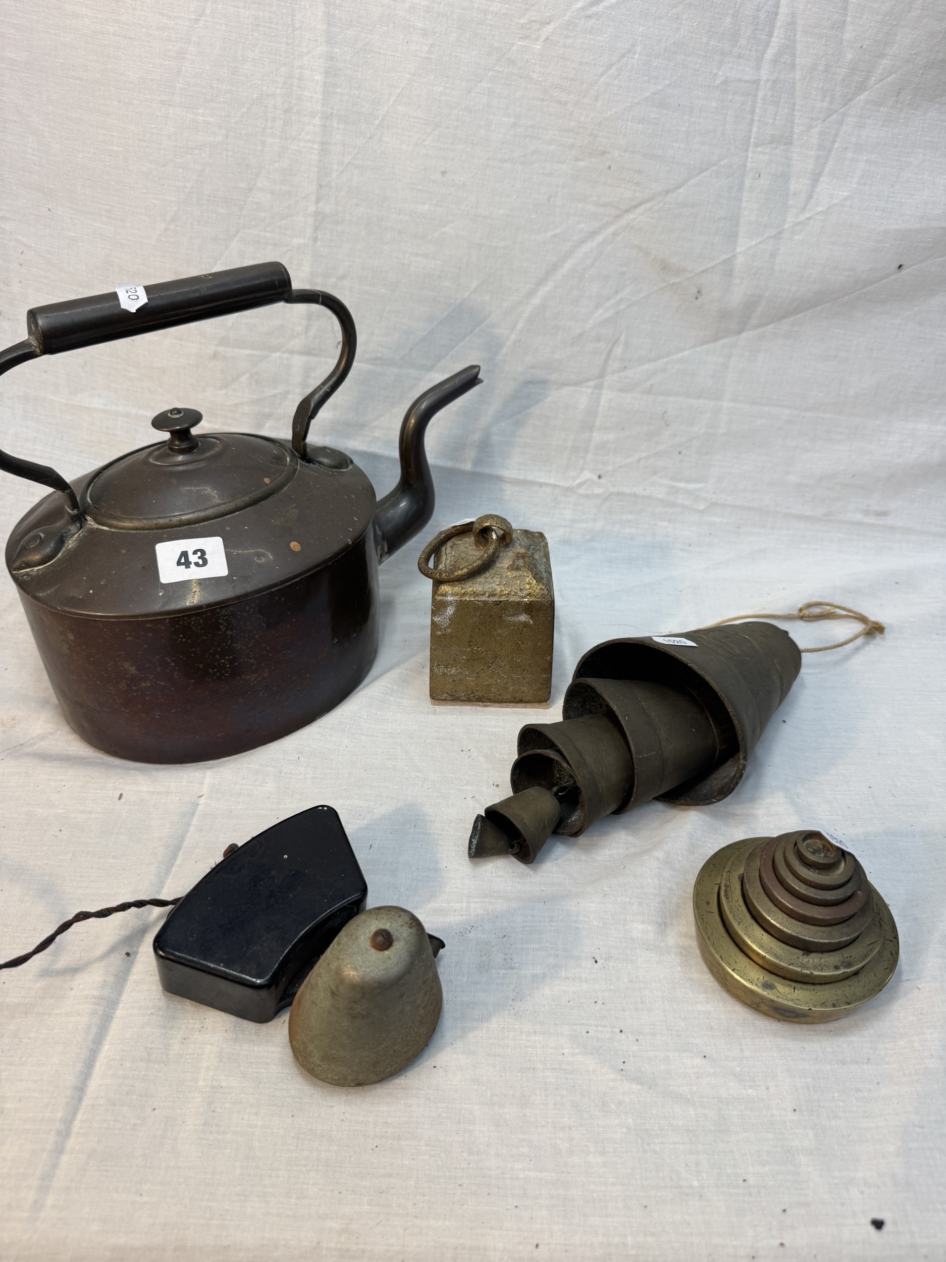 Mixed lot of metal wear to include a set of middle eastern camel bells, graduating weight etc.