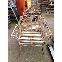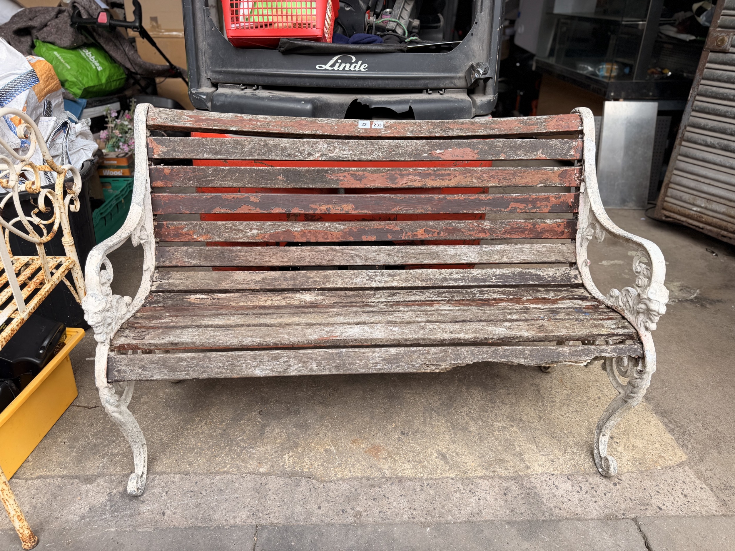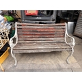 Old weathered garden bench with painted cast metal ends (AF)