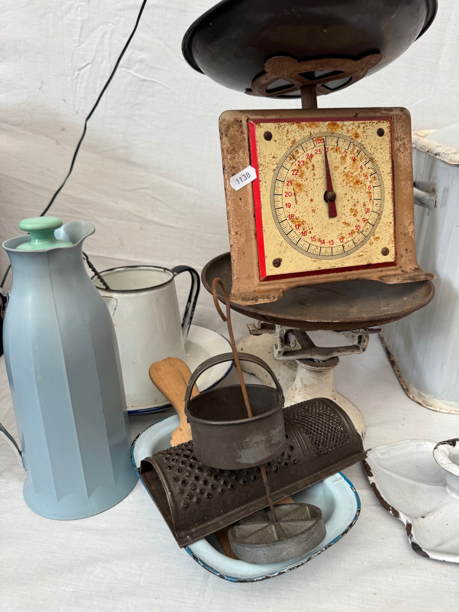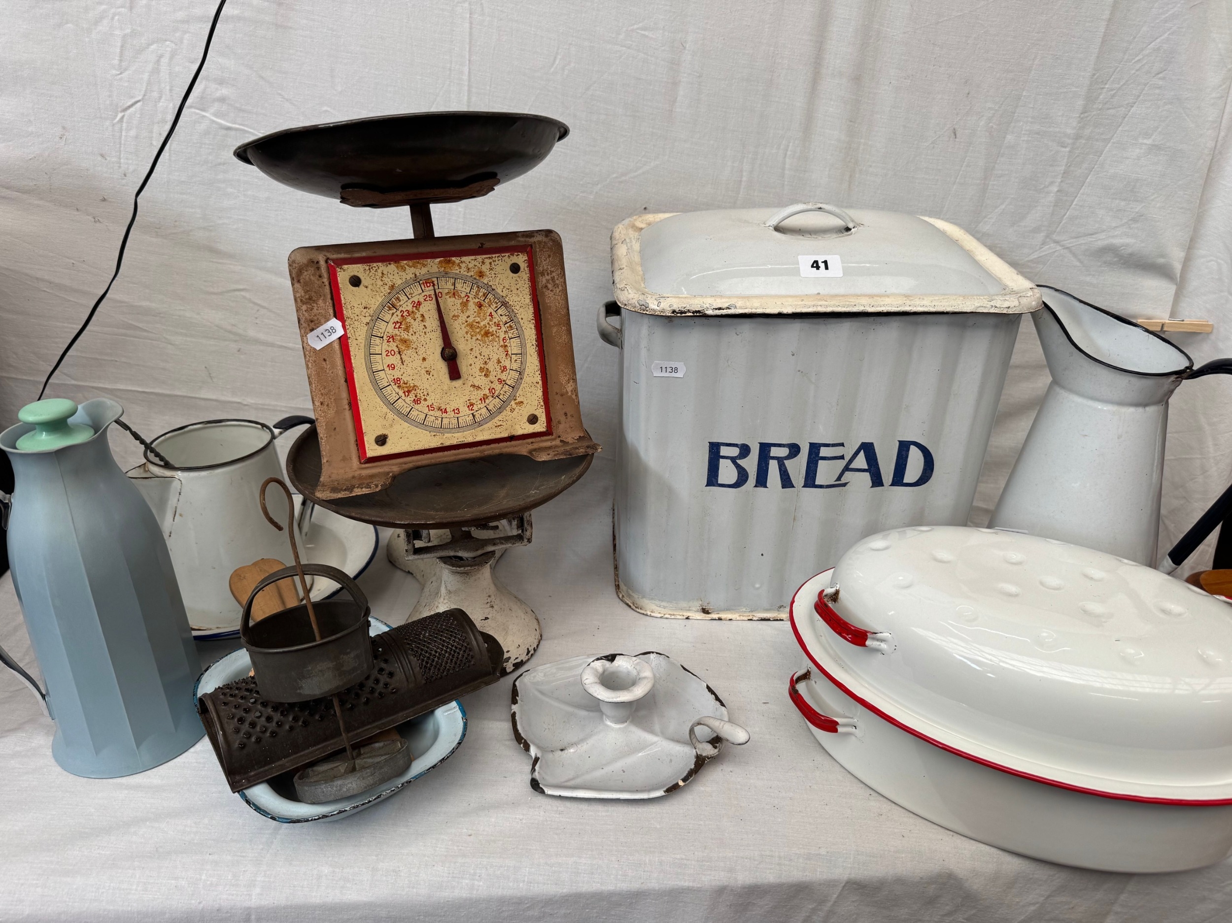 Mixed collection of antique and vintage domestic kitchen enamel items to include bread bin and cover, ewer, jug, chamber sick, tureen etc together wirth other vintage kitchenalia to include grater, butter paddles etc