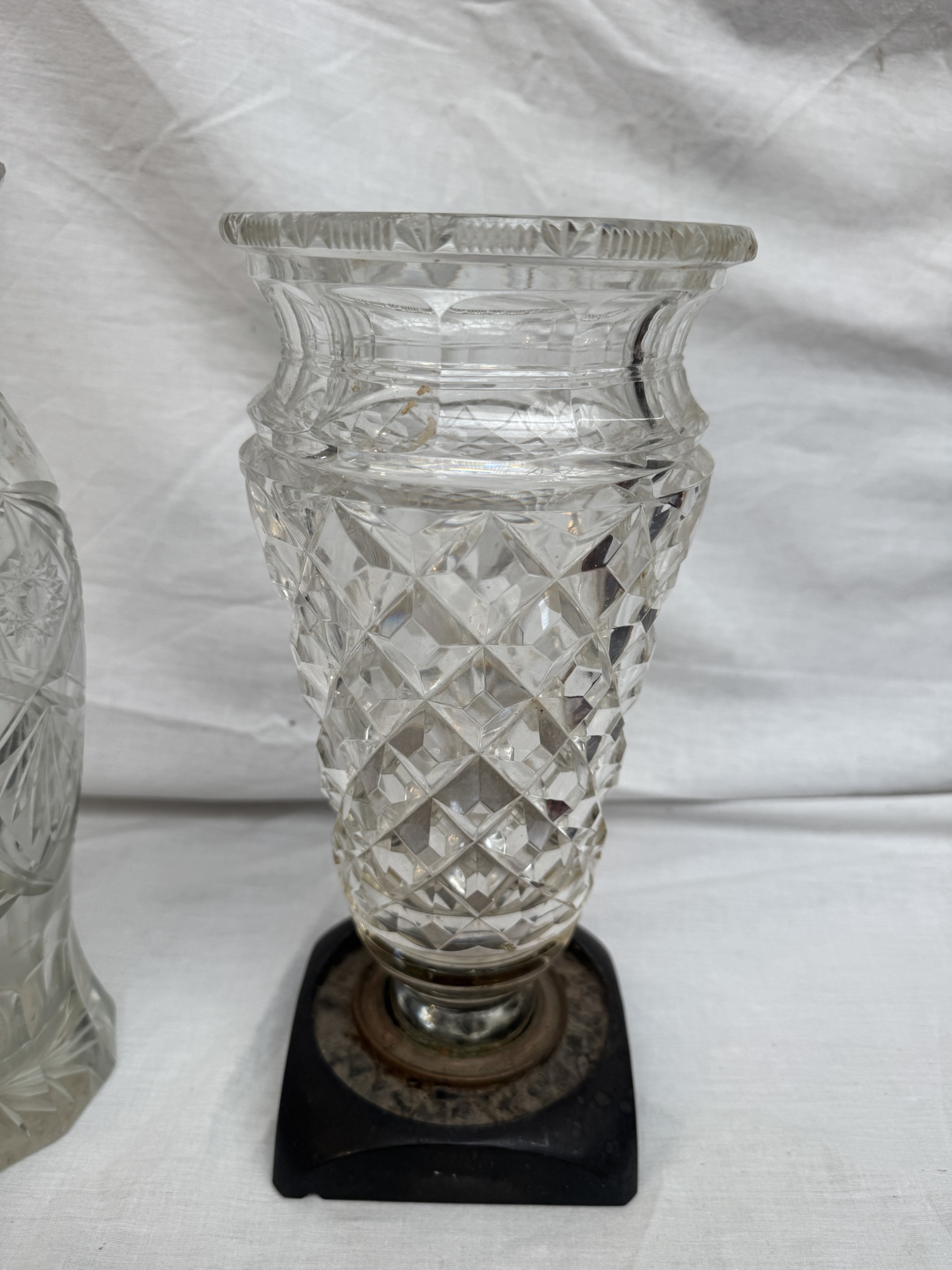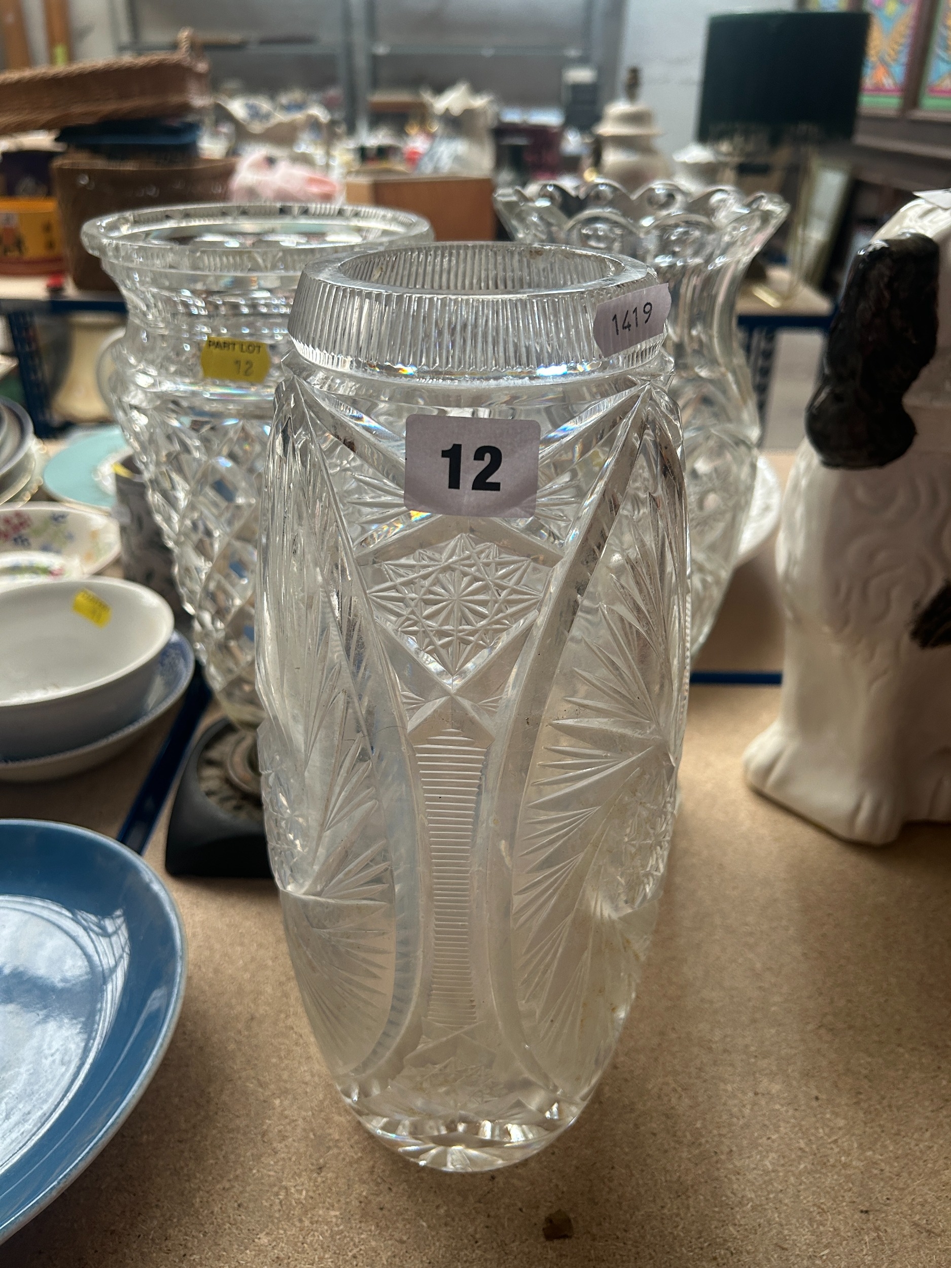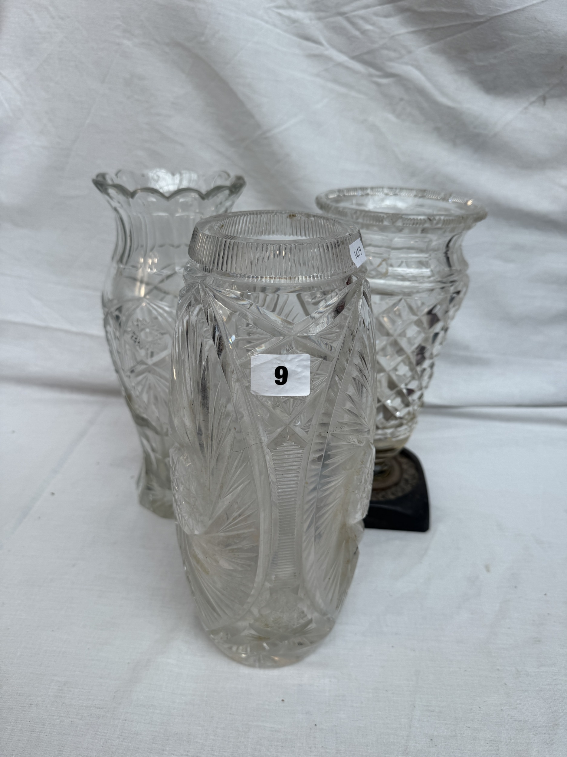 Three various heavy clear cut glass vases, 31cm high maximum (3)