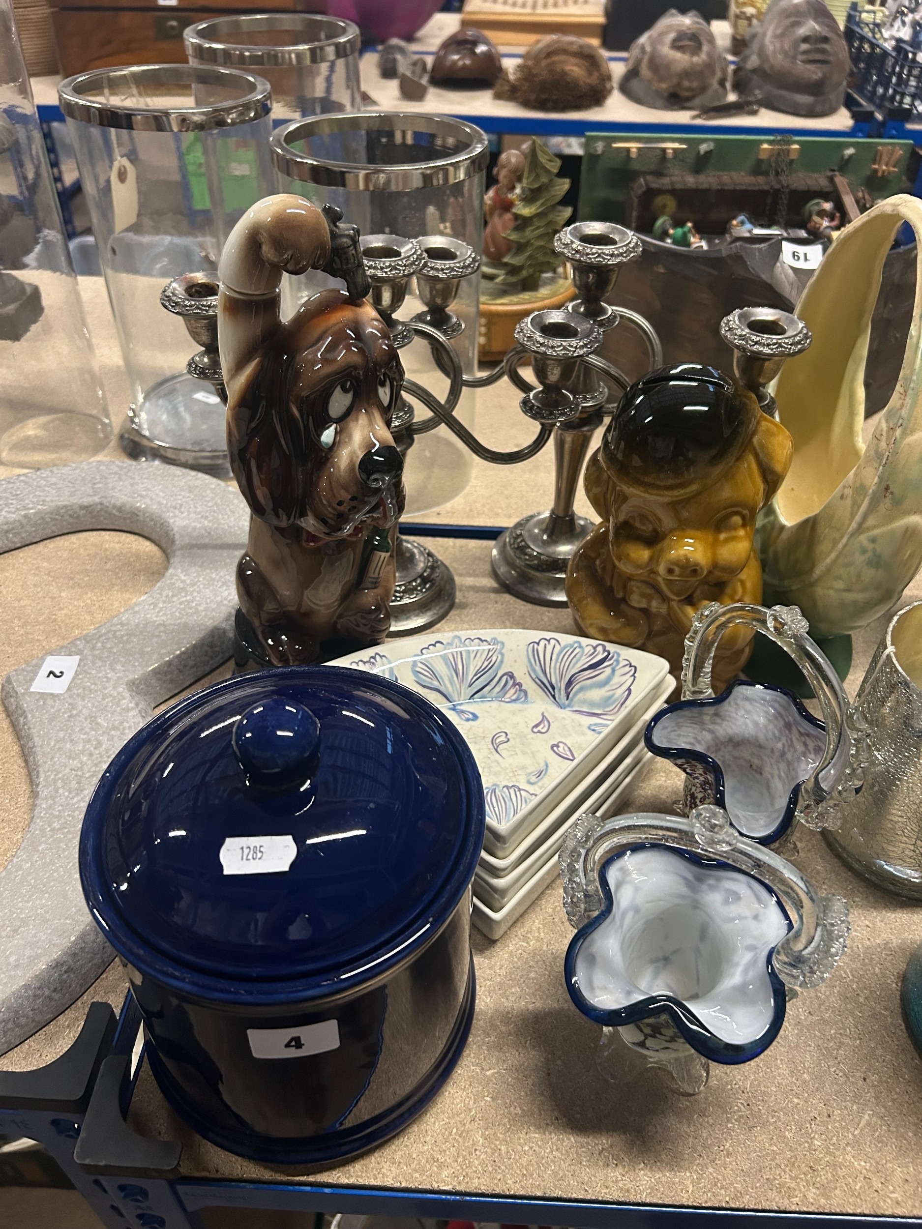 Varied mixed collection to include novelty humorous musical decanter ‘The Last Shot’, piggy bank, entree dish set, art glass baskets etc
